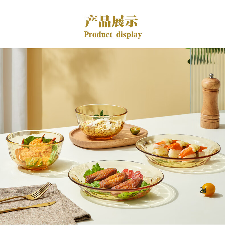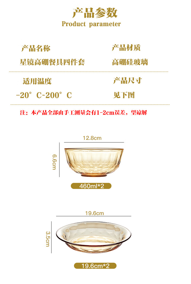 装 箱 规格:10套 /箱适用温度:-20°C-200°C材 质:高硼硅玻璃产品参数:小碗460ml*2、 盘196mm*2彩盒尺寸:342*82*259mm 外箱尺寸:43.5*35.4*53.7cm
