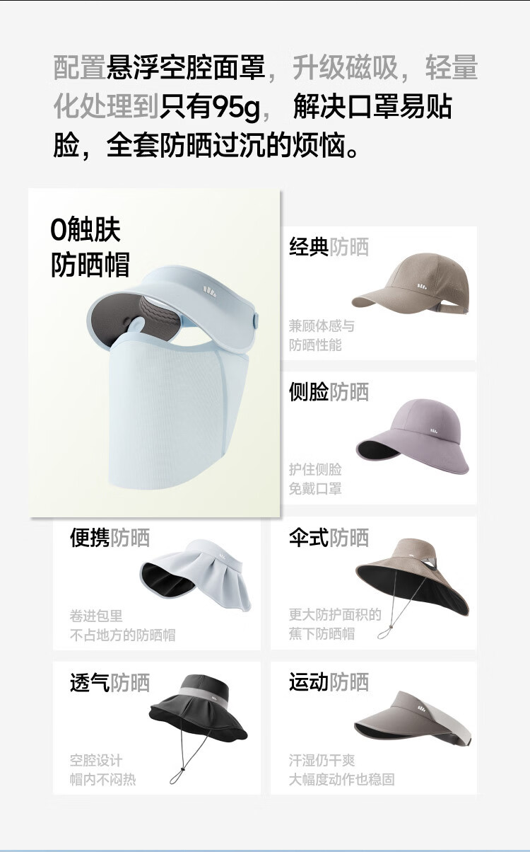 蕉下面护帽、[0触肤]的面部物理屏障磁吸技术、脱戴不蹭脸久戴无勒痕重新定义无接触式面颈防晒