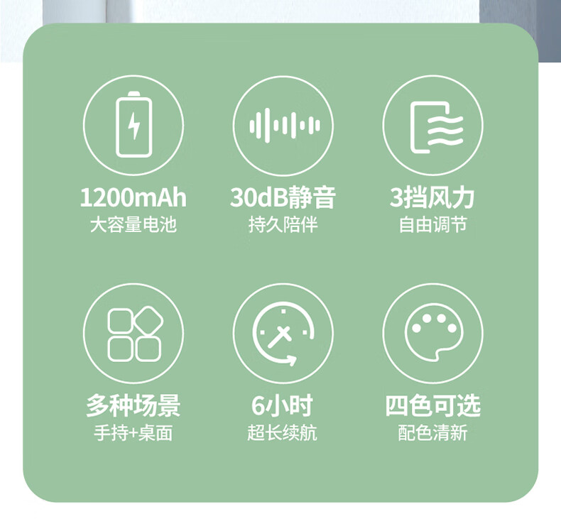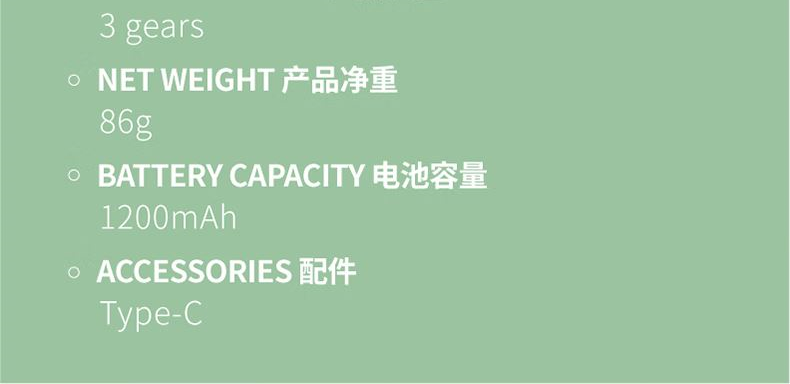 产品颜色:白色 粉色 绿色 紫色 产品尺寸:14*6.7*5.3cm 产品材质:ABS 输 入:5V/1A 电池容量:1200mAh 功 率:3w 使用时间:1-2.5小时 产品重量:86g 装 箱数量:80个 装 箱重量:12kg 彩盒尺寸:6.7*5.3*14.2cm 装 箱尺寸: 54*28.5*28.8cm