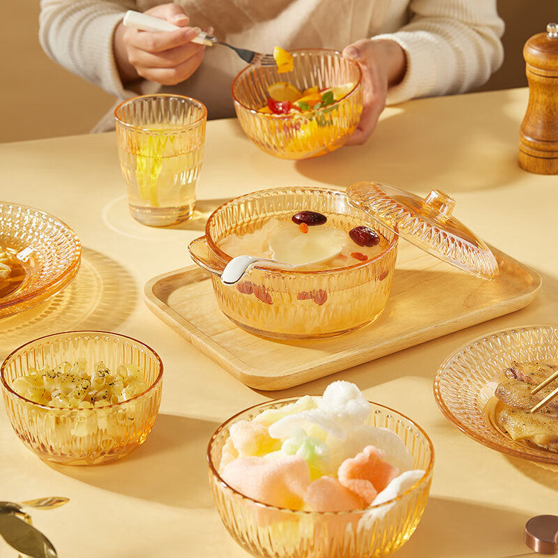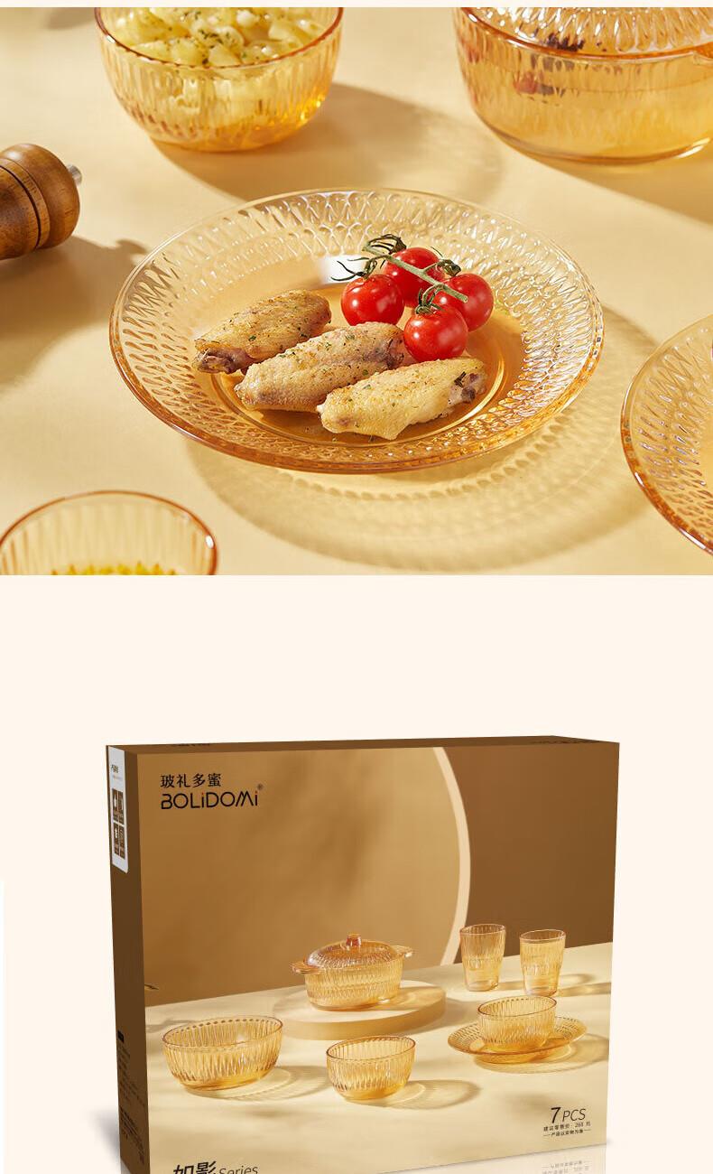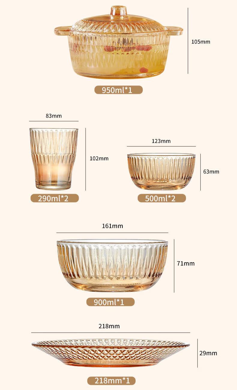 【规格】:6套 /箱 【组合】:水晶煲950ml*1、小碗500ml*2、水杯290ml*2 大碗900ml*1、盘子218mm*1 【材质】:钠钙玻璃 0~60℃ 【彩盒尺寸】:416*112*361mm 【外箱尺寸】:70*43*38cm 【毛重】: 15KG 【69码】: 6978749240640