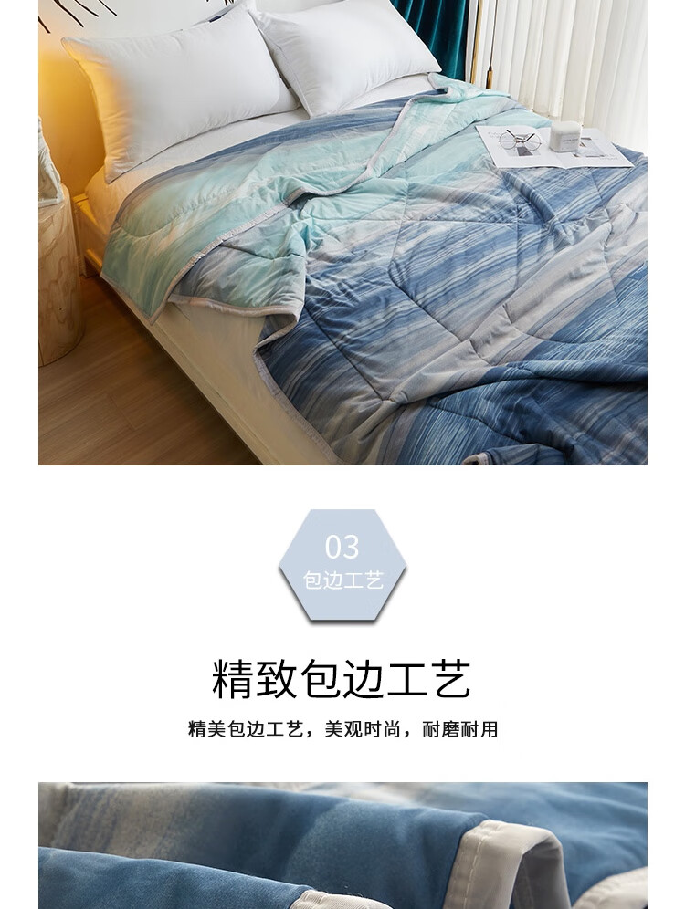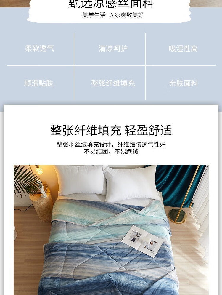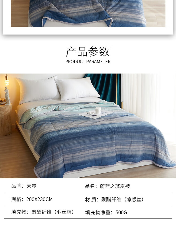 规格:200x230cm 材质:聚酯纤维(凉感丝) 填充物:聚酯纤维(羽丝棉) 填充物净重:500g