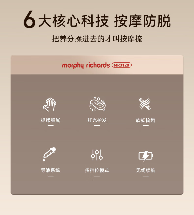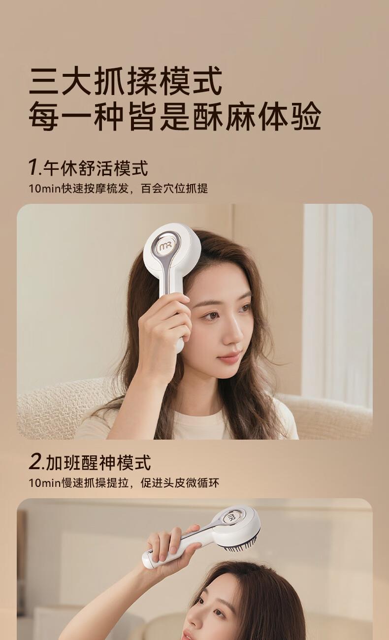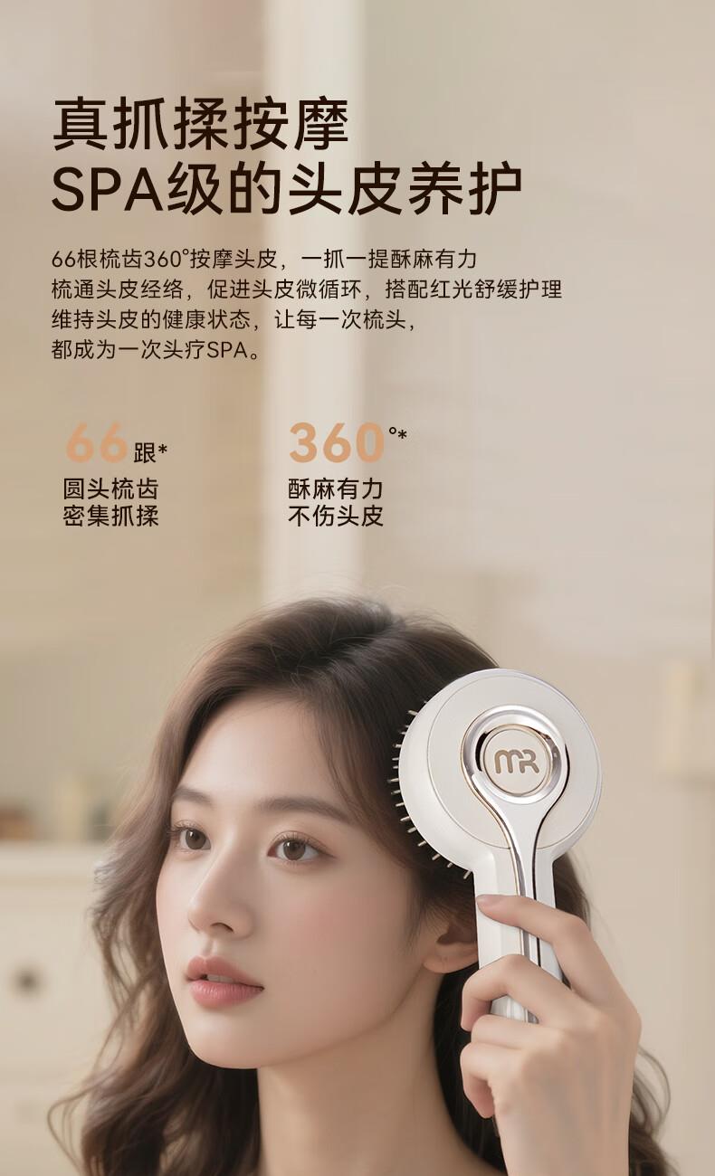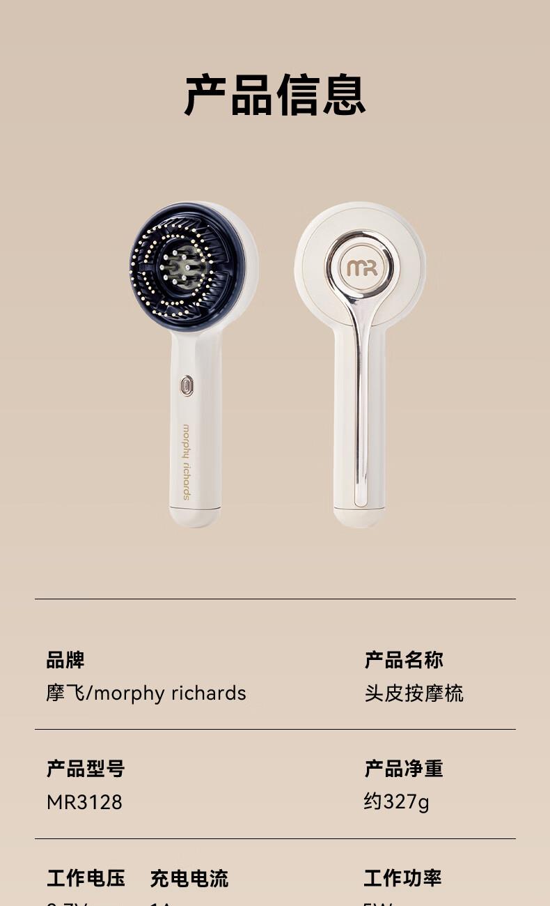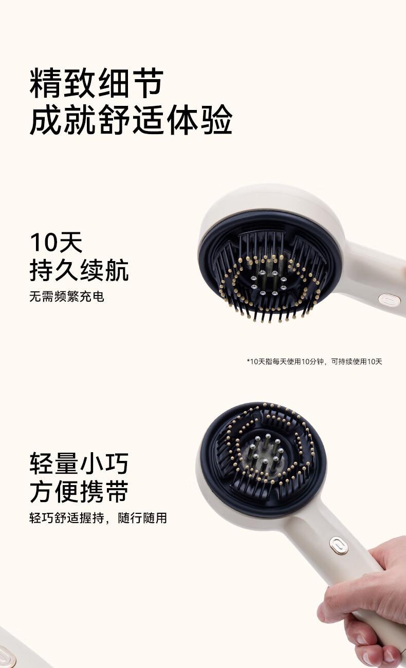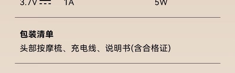按摩梳 续航:约12个循环(开机默认模式) 充电时间:≈120min 充电电压:5V/1A 工作电压:3.7V 额定功率:10W 充电接口:Type-C 电池容量:1400毫安 材质:ABS+PP+硅胶 执行标准:GB4706.1-2005/GB4706.10-2008 配件:主机,充电线,说明书