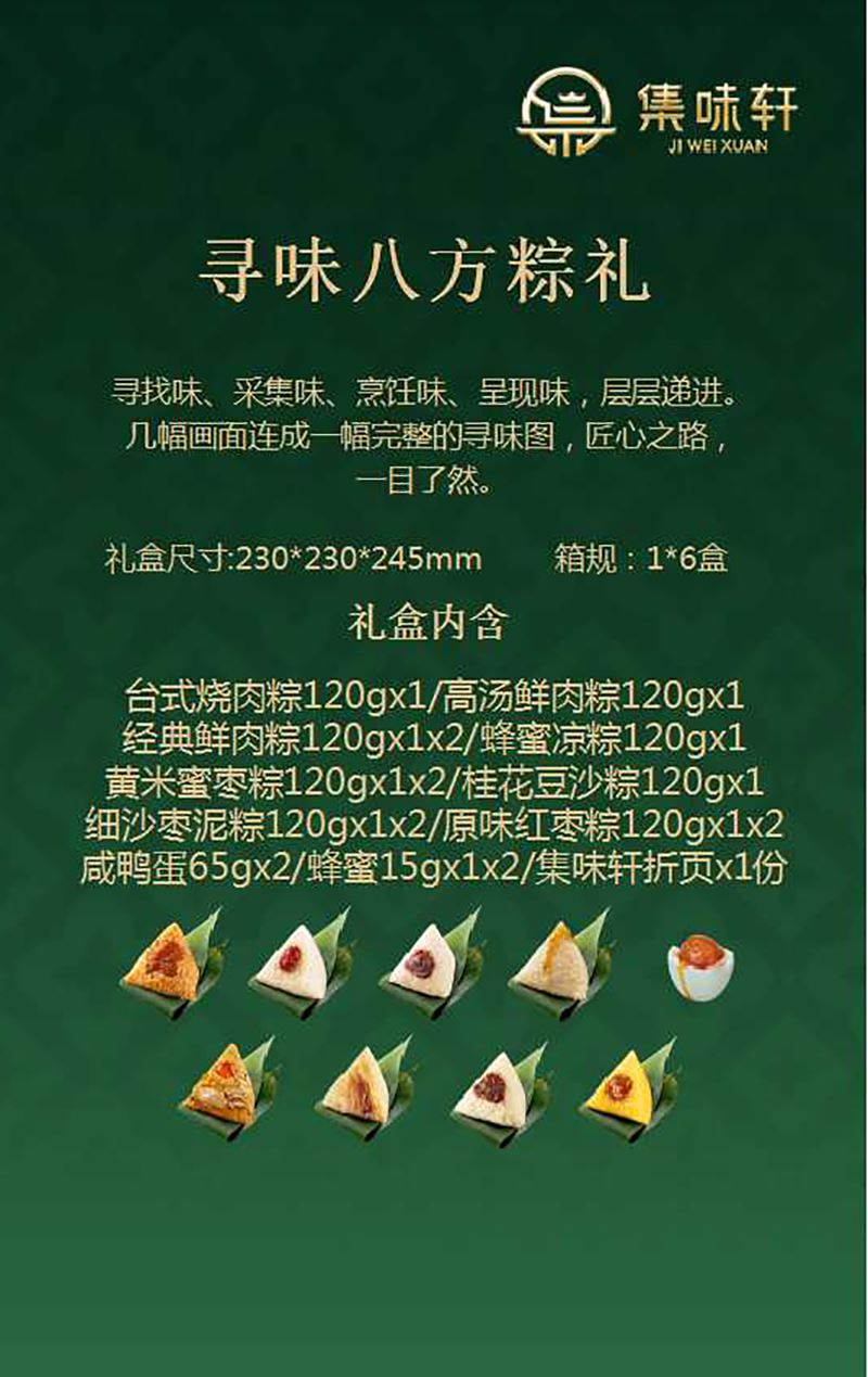 台式烧肉粽120gx1 高汤鲜肉粽120gx1 经典鲜肉粽120gx1x2 蜂蜜凉粽120gx1 黄米蜜枣粽120gx1x2 桂花豆沙粽120gx1 细沙枣泥粽120gx1x2 原味红枣粽120gx1x2 咸鸭蛋65gx2 蜂蜜15gx1x2 集味轩折页x1份