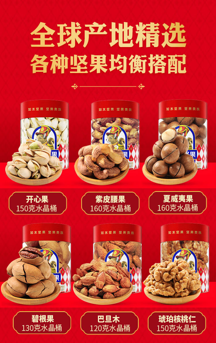 如水紫皮腰果160g 如水开心果150g 如水琥珀核桃仁150g 如水原味南瓜籽仁180g 如水夏威夷果160g 如水碧根果130g 如水巴旦木120g 如水蔓越莓干180g