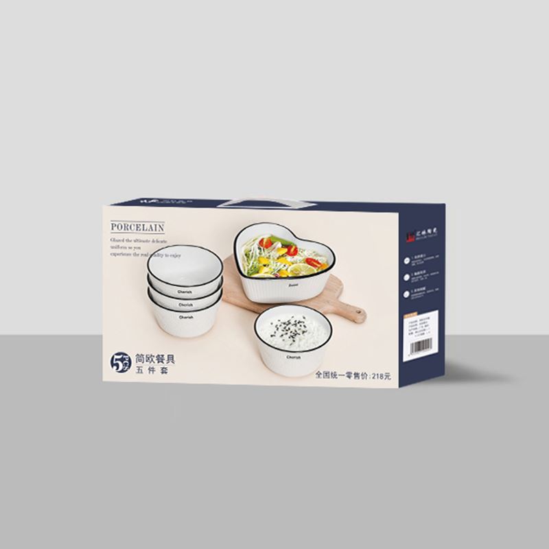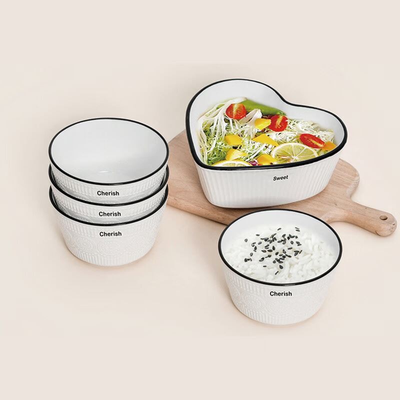 产品规格:桃心沙拉碗 * 1 4.5寸饭碗 * 4 彩盒尺寸:38.7x23.1x7.4 产品毛重:1920g