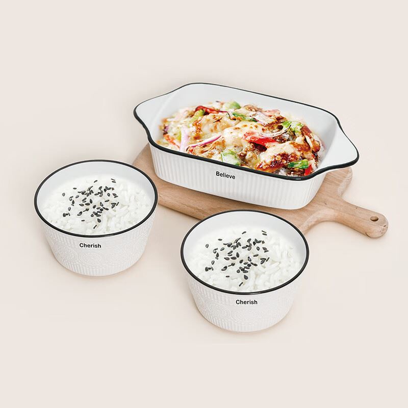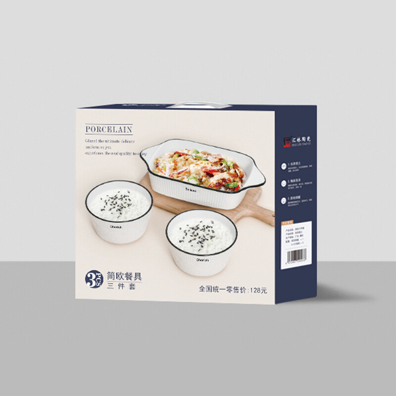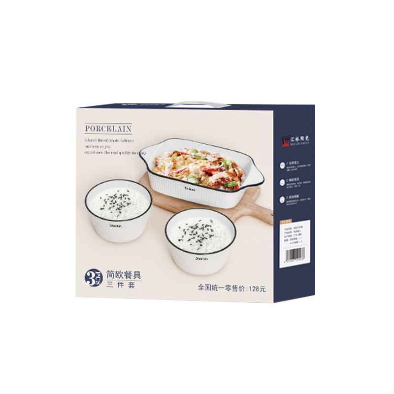 产品规格:双耳烤盘 * 1 4.5寸饭碗 * 2 彩盒尺寸:25.2x24.3x6.8