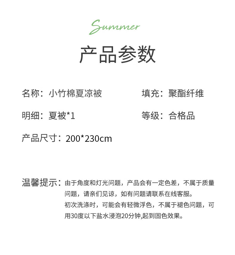 面 料: 小竹棉 填 充: 整张羽丝棉 规 格: 200*230cm 克 重: 1500g 包 装: 手提盒