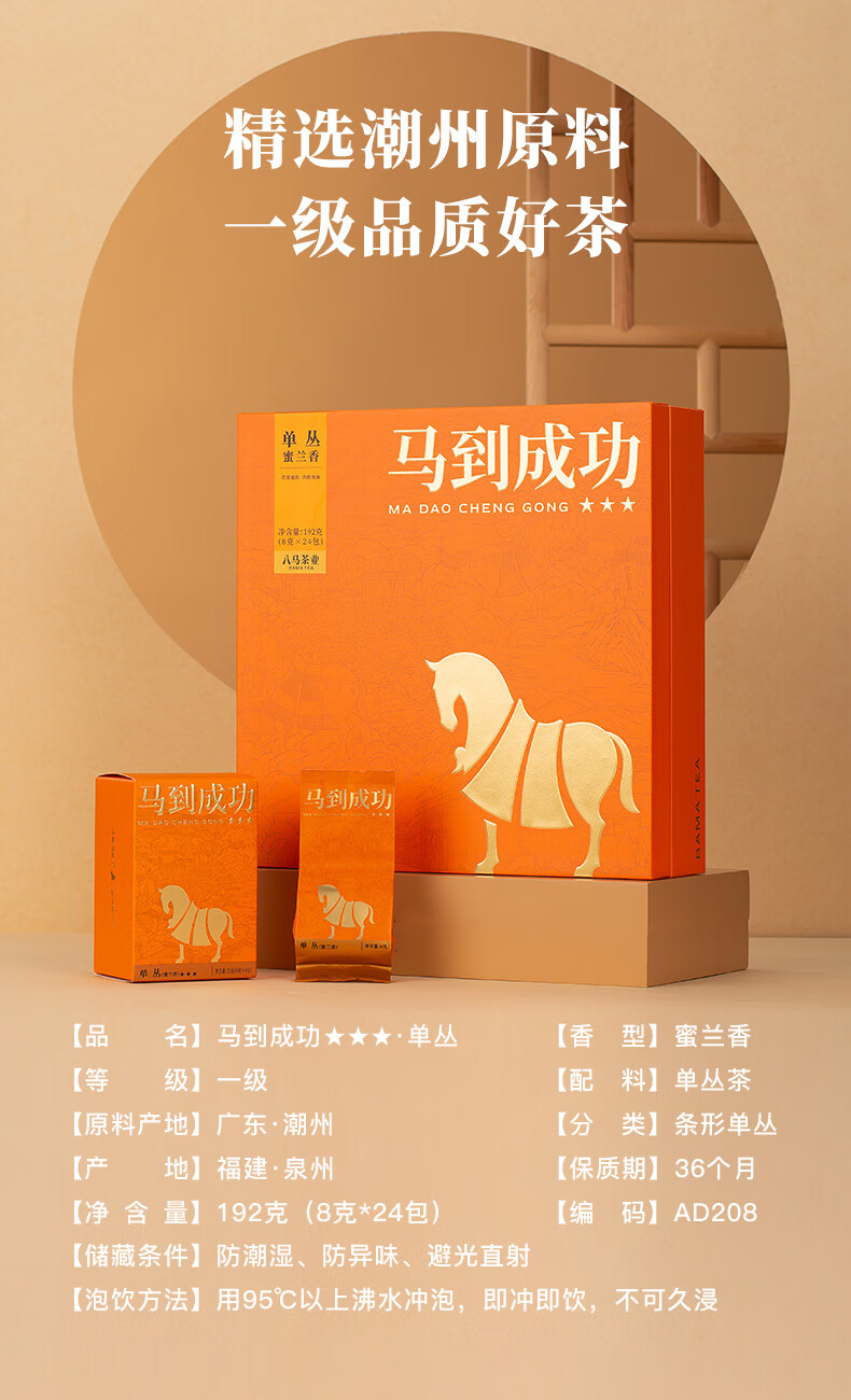 品 名]马到成功★★★·单丛[香型]蜜兰香 [等级]一级 [配料]单丛茶 [原料产地]广东·潮州 [分类]条形单丛 [产地]福建.泉州 【保质期]36个月 [净含量]192克(8克*24包) [编码]AD208 [储藏条件]防潮湿、防异味、避光直射 【泡饮方法]用95℃以上沸水冲泡,即冲即饮,不可久浸
