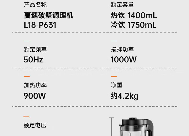 型号:L18-P631 包装尺寸: 435×255×326mm 毛重:5.4KG 加热功率/电压:900W/220V/50HZ 容量:900-1300ml