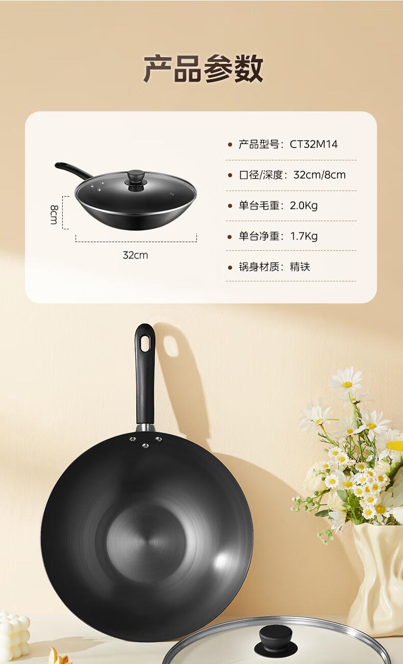 口径规格:32cm 锅内深度:8cm锅身材质:精铁商品条形码:6936718344928 毛重:2 kg 包装尺寸:363 x 122 x 398 mm