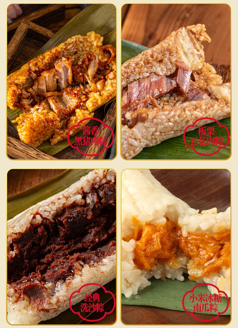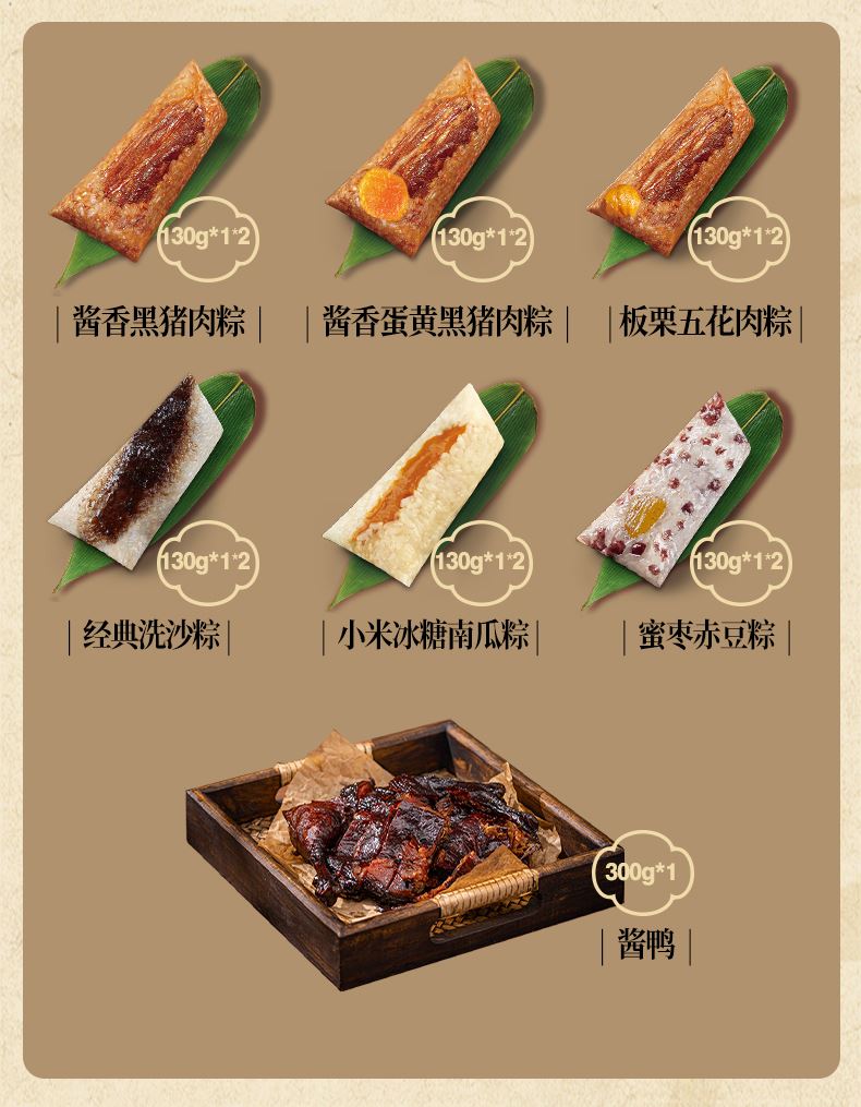 130克*2真空酱香蛋黄黑猪肉粽 130克*2真空酱香黑猪肉粽 130克*2真空板栗五花肉粽 130克*2真空经典洗沙粽 130克*2真空小米冰糖南瓜粽 130克*2真空蜜枣赤豆粽 300克*1真空酱鸭