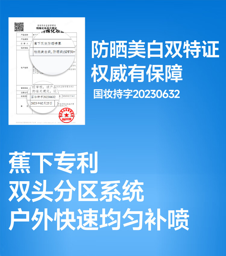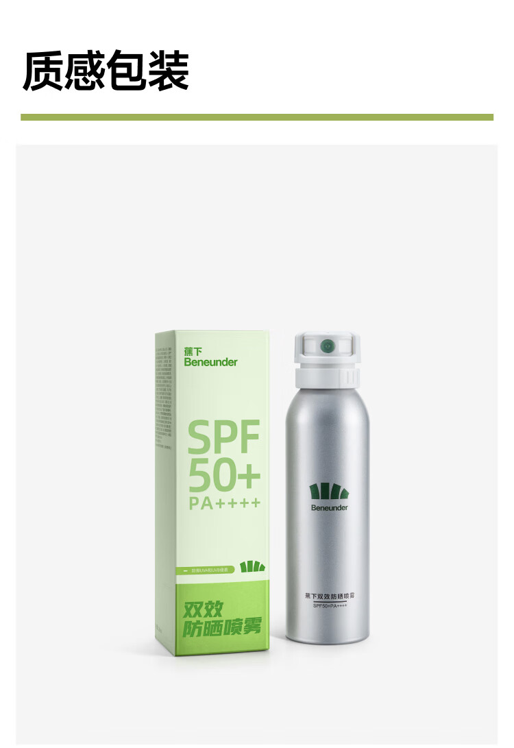 既防晒也防水暴汗湿肤可用 自带两种喷头分向补喷更精 准 添加3%烟酰胺防晒美白双效合9