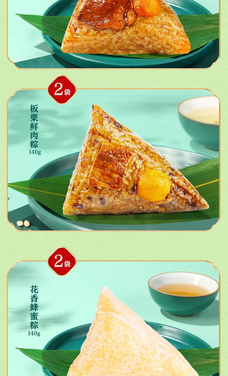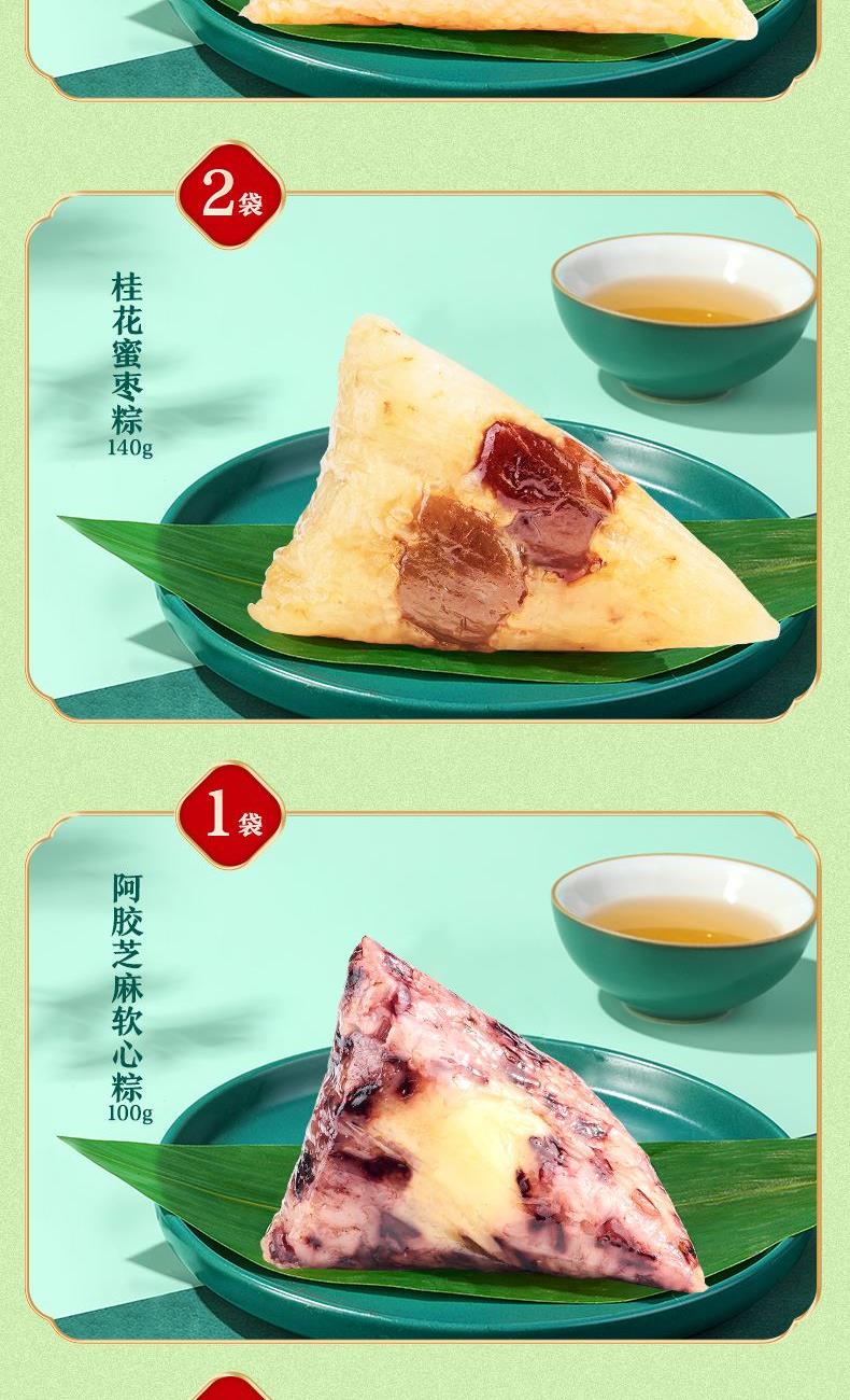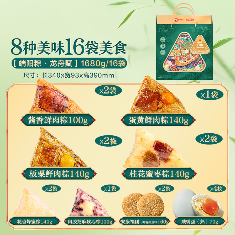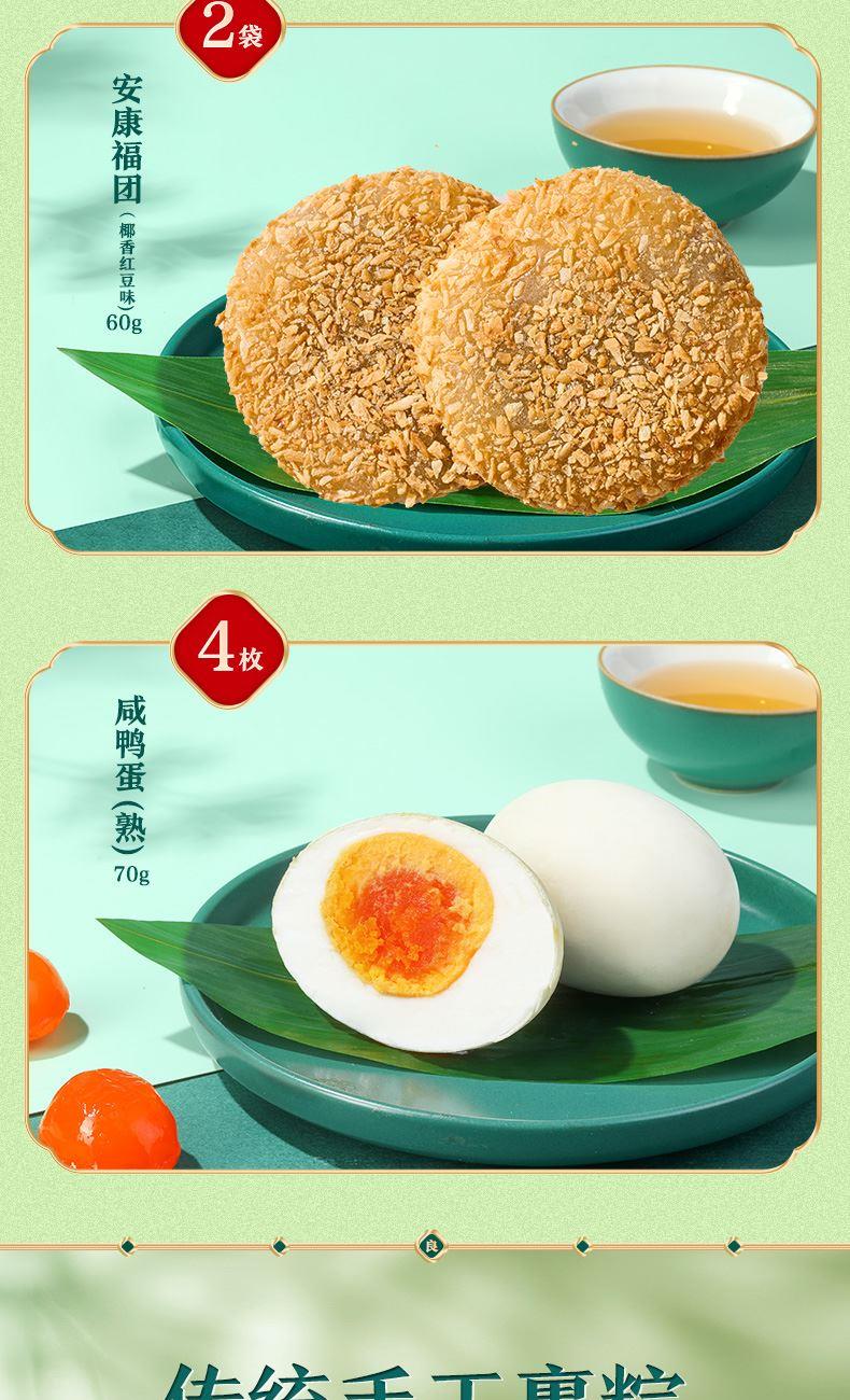 酱香鲜肉粽100g*2 蛋黄鲜肉粽140g*1 板栗鲜肉粽140g*2 桂花蜜枣粽140g*2 花香蜂蜜粽140g*2 阿胶芝麻软心粽100g*1 安康福团(椰香红豆味)60g*2 咸鸭蛋(熟)70g*4