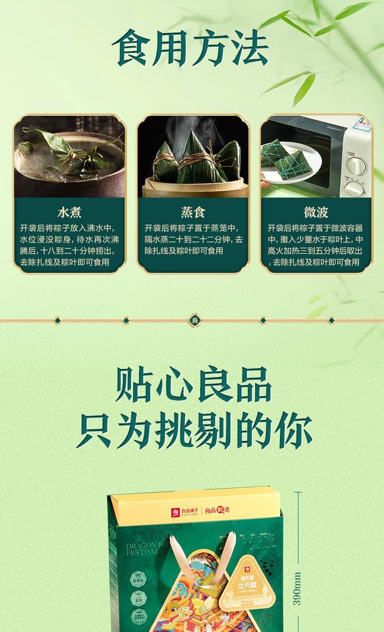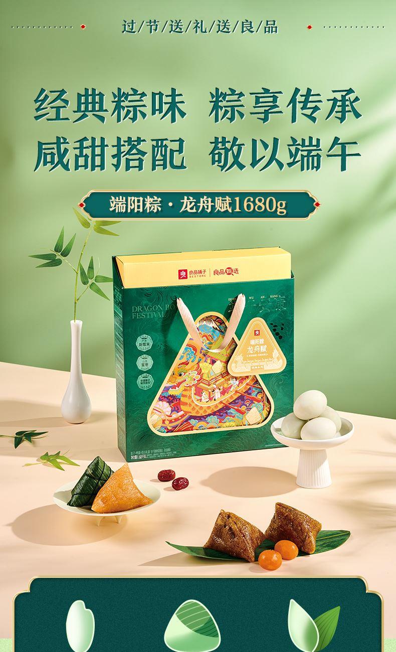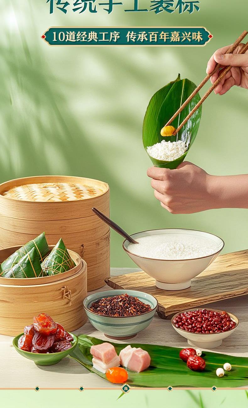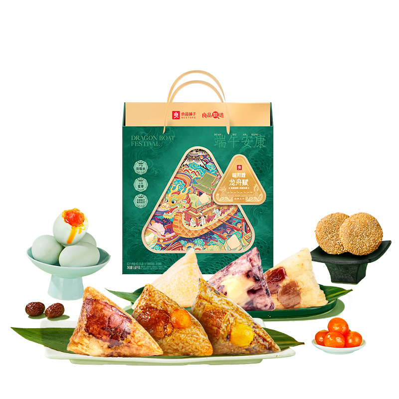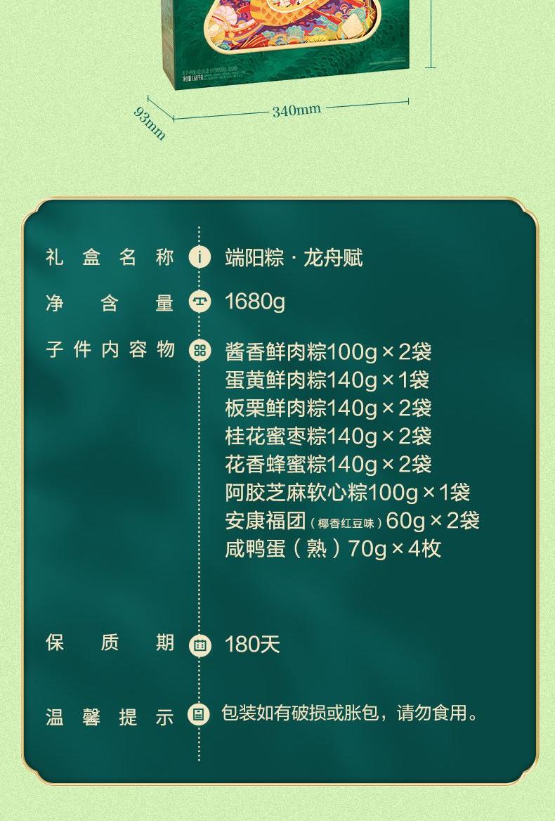 酱香鲜肉粽100g*2 蛋黄鲜肉粽140g*1 板栗鲜肉粽140g*2 桂花蜜枣粽140g*2 花香蜂蜜粽140g*2 阿胶芝麻软心粽100g*1 安康福团(椰香红豆味)60g*2 咸鸭蛋(熟)70g*4