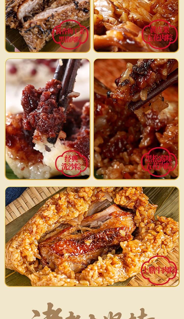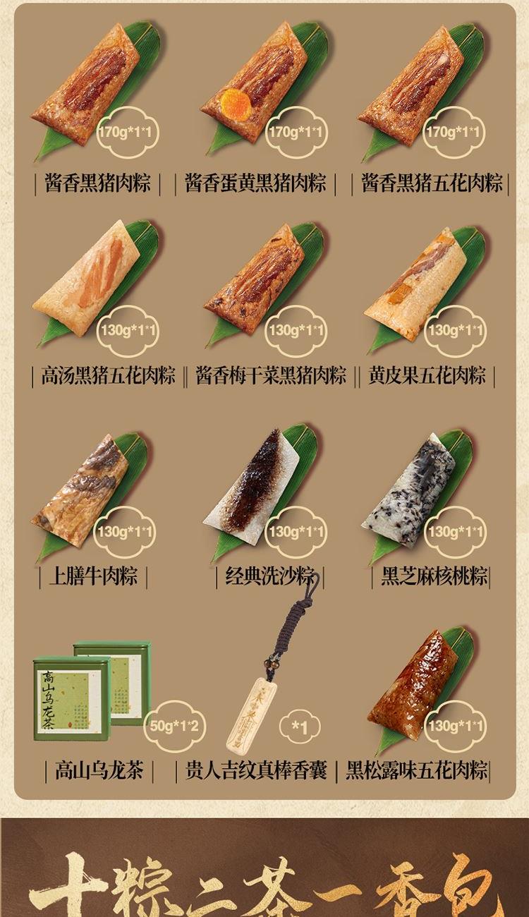 170克*1真空酱香黑猪肉粽 170克*1真空酱香蛋黄黑猪肉粽 170克*1真空酱香黑猪五花肉粽 130克*1真空黑松露味五花肉粽 130克*1真空上膳牛肉粽 130克*1真空酱香梅干菜黑猪肉粽 130克*1真空高汤黑猪五花肉粽 130克*1真空黄皮果五花肉粽 130克*1真空经典洗沙粽 130克*1真空黑芝麻核桃粽 50克*2高山乌龙茶 贵人吉纹真棒香囊