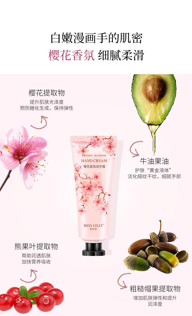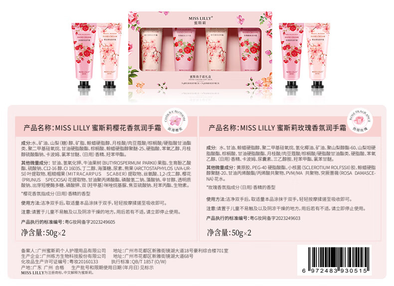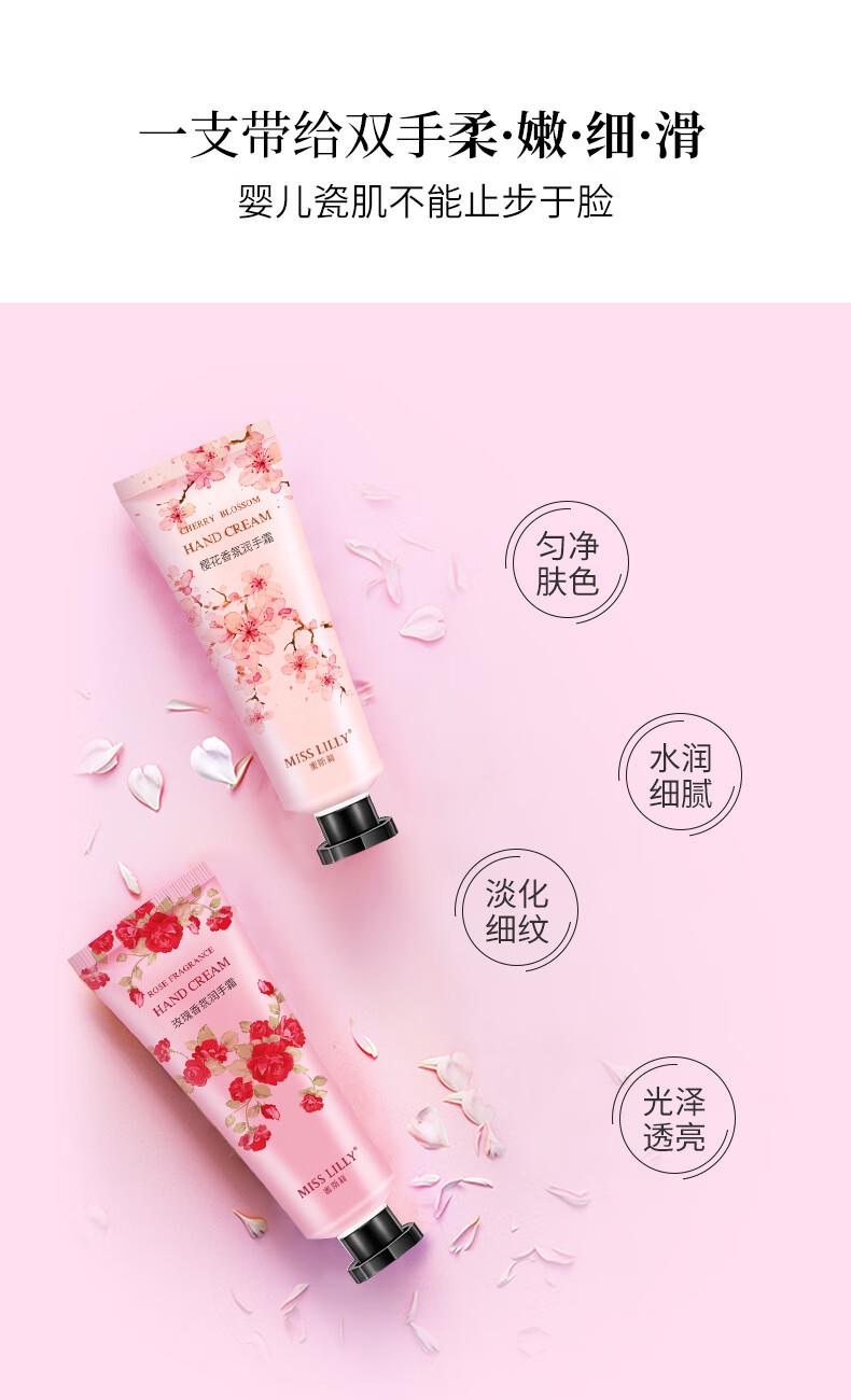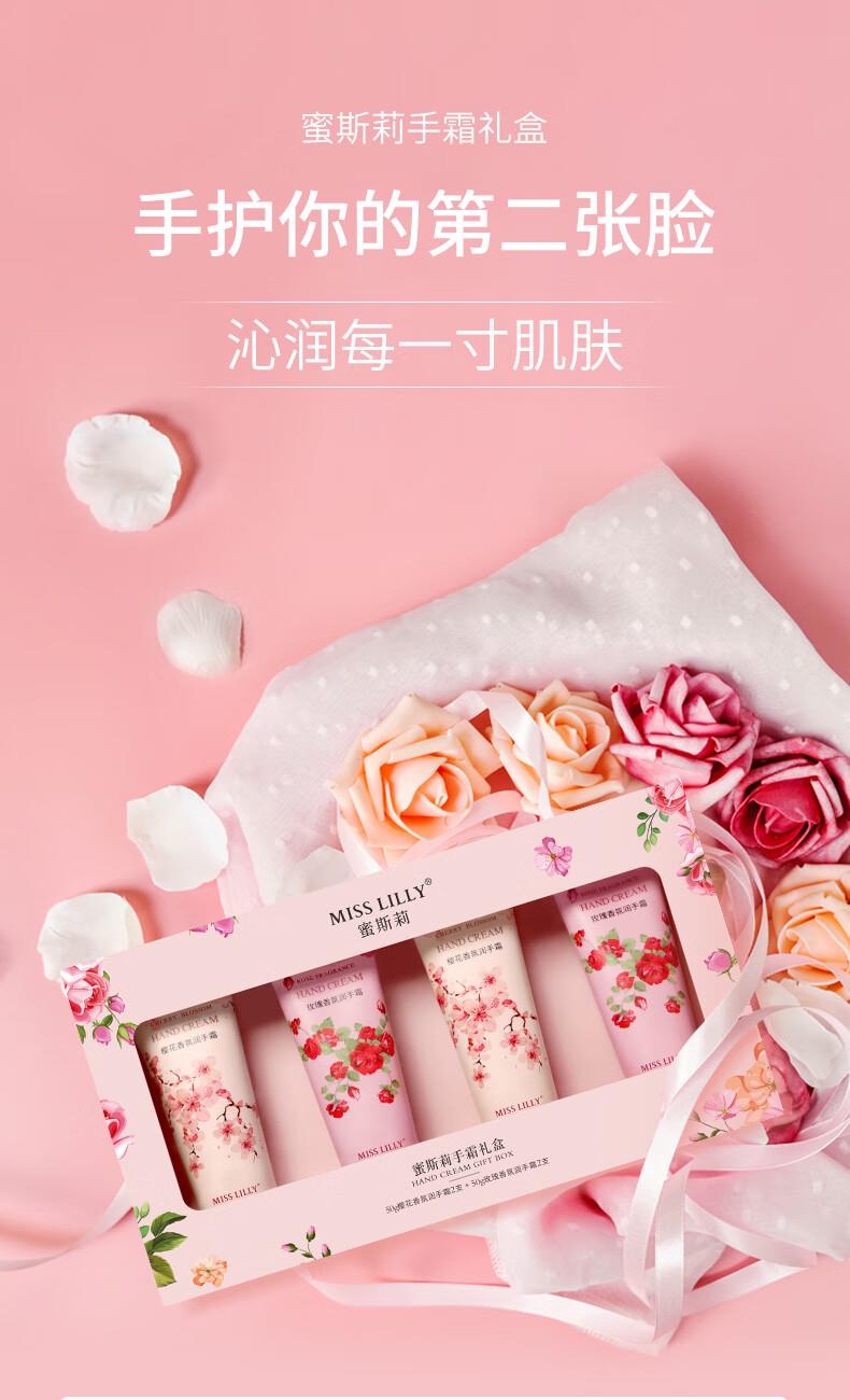 1.MISS LILLY蜜斯莉玫瑰香氛润手霜50g*2 2.MISS LILLY蜜斯莉樱花香氛润手霜50g*2 3.礼盒*1