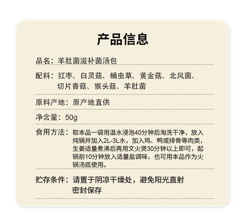 产品配置: 有机白木耳80g 有机滑子菇100g 有机猴头菇100g 有 机 元 蘑100g 有 机 香 菇80g 有 机 红 枣350g 净含量:810g
