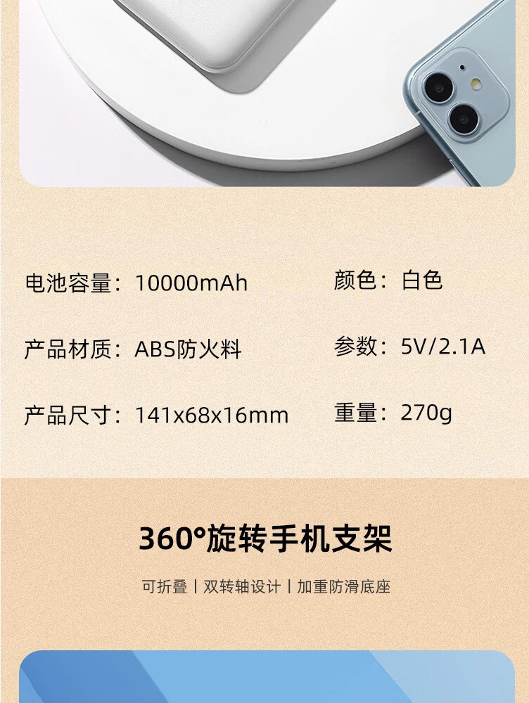 容量:10000mAh(典型值) 功率:5V⎓2.1A