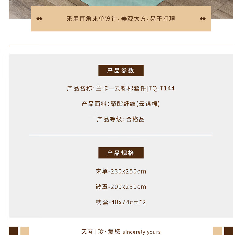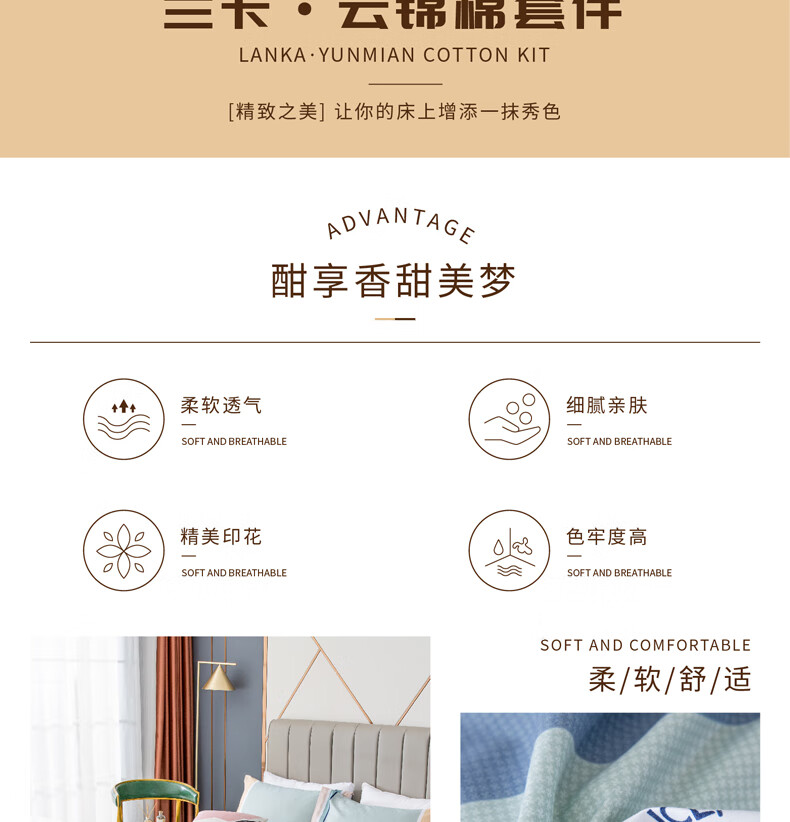 规格:床单:230x250cm 被罩:200x230cm 枕套:48x74cm*2 材质:聚酯纤维(云锦棉)