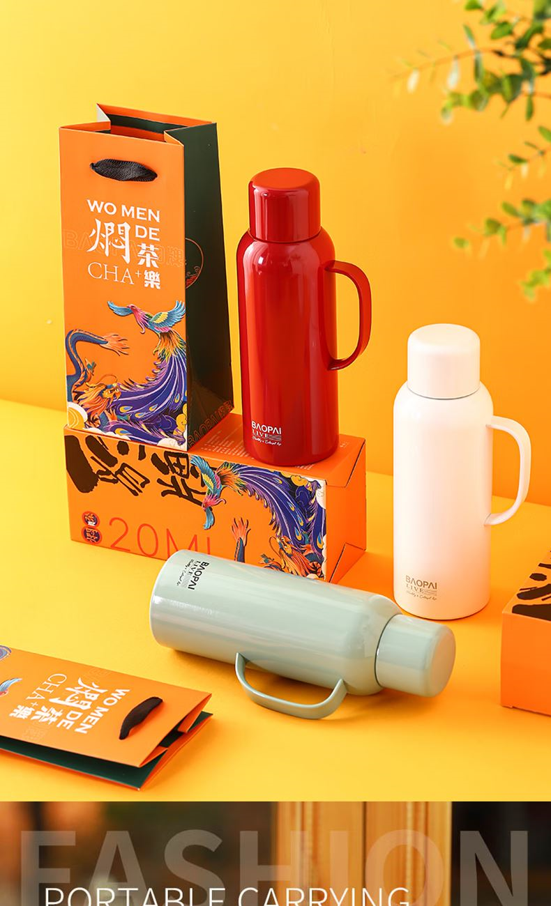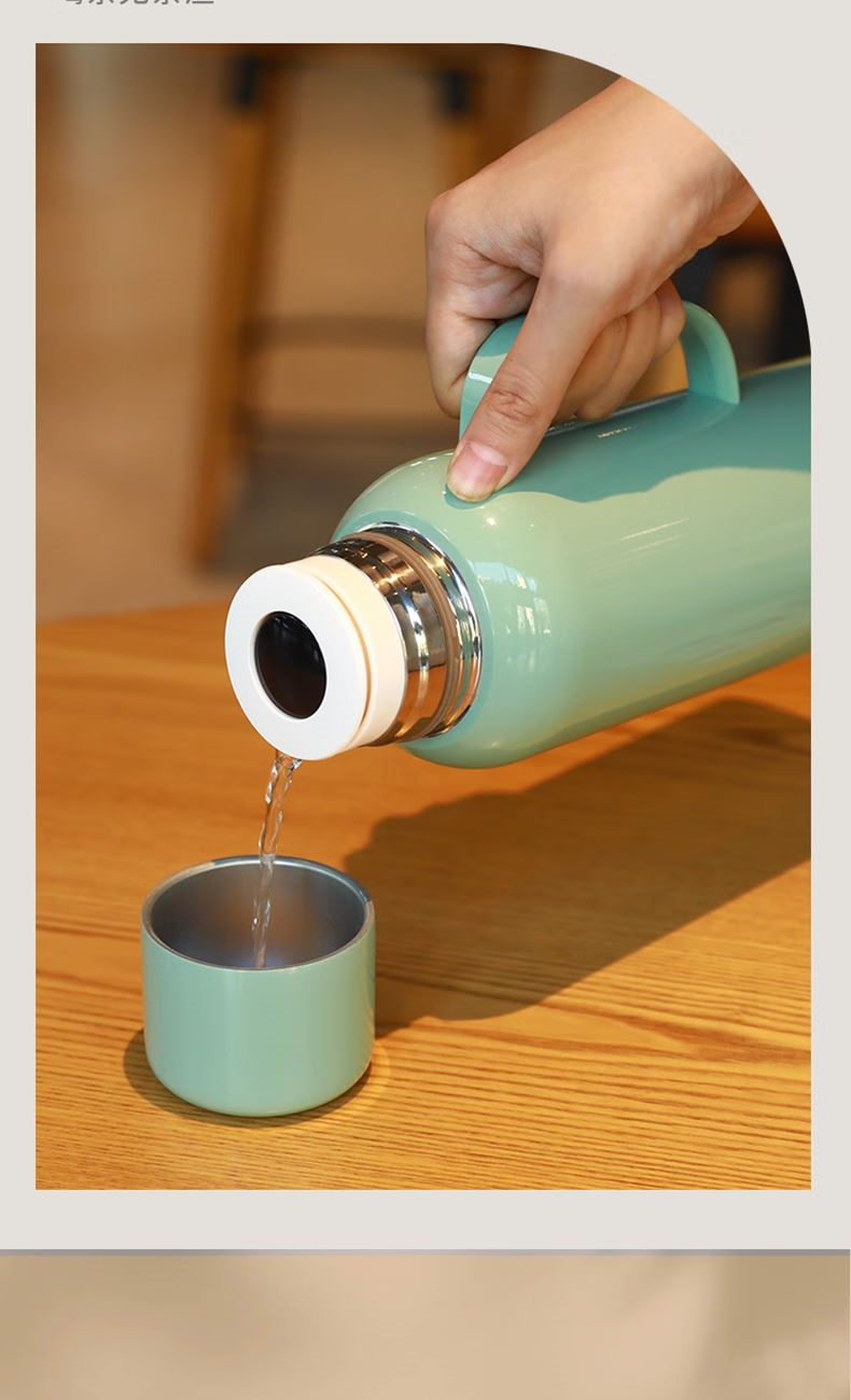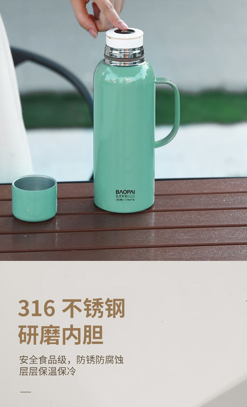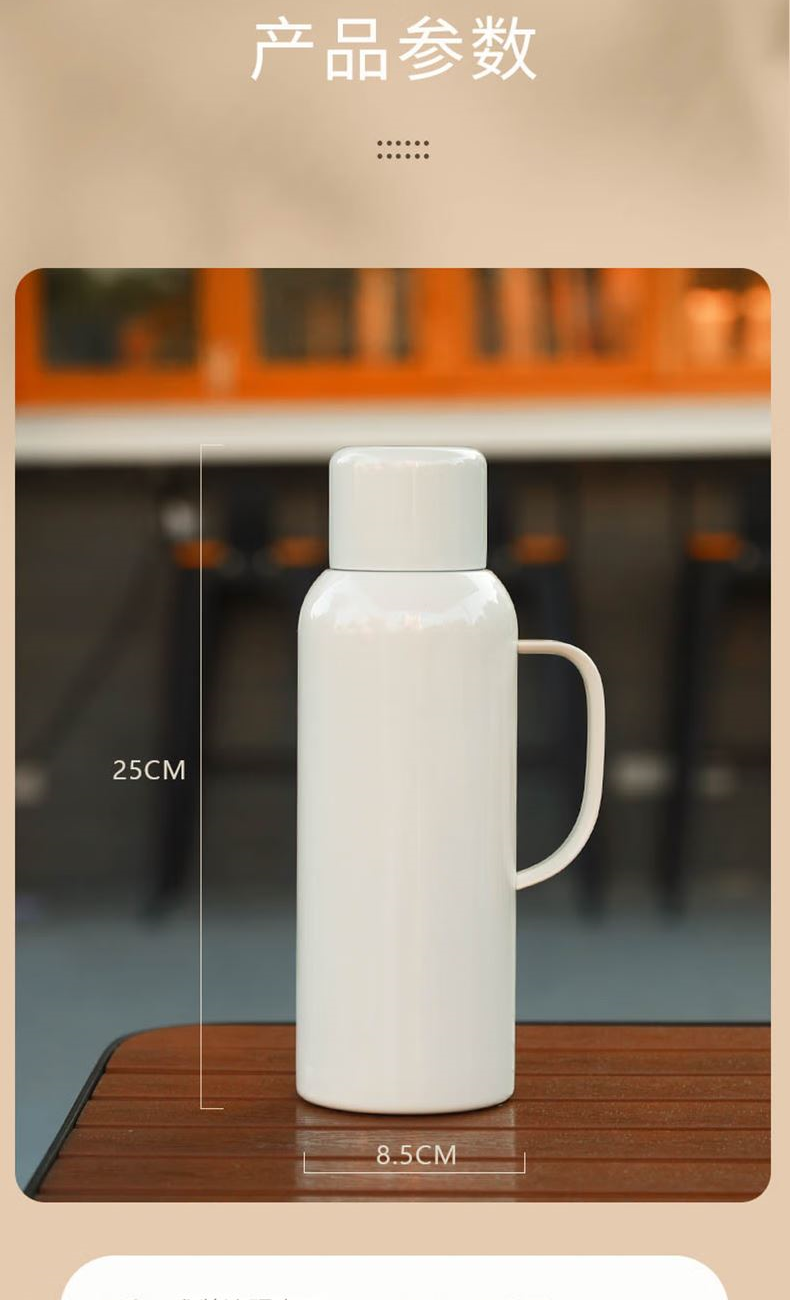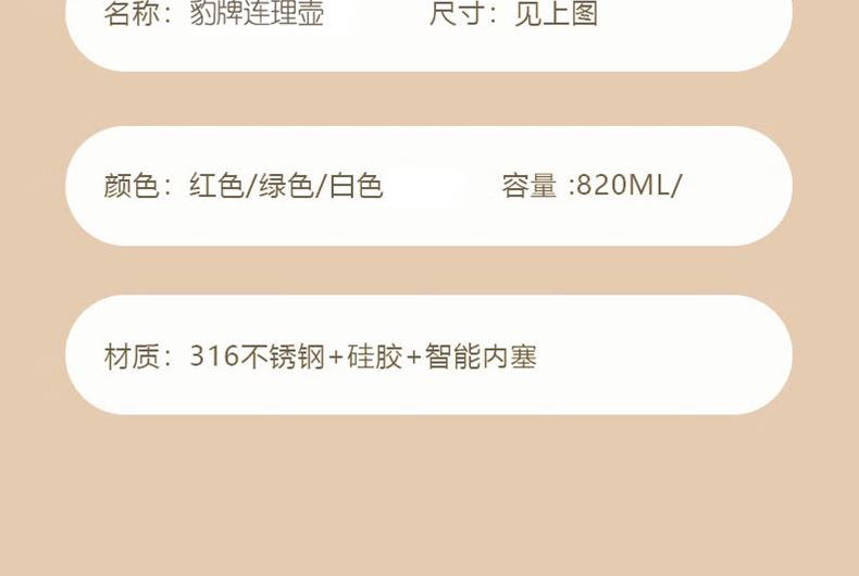 水杯容量:820ml 产品材质: 316不锈钢+硅胶+智能内塞 产品尺寸:85*85*250mm 产品重量:0.7KG 包装方式:彩盒包装颜色:白色、红色、绿色