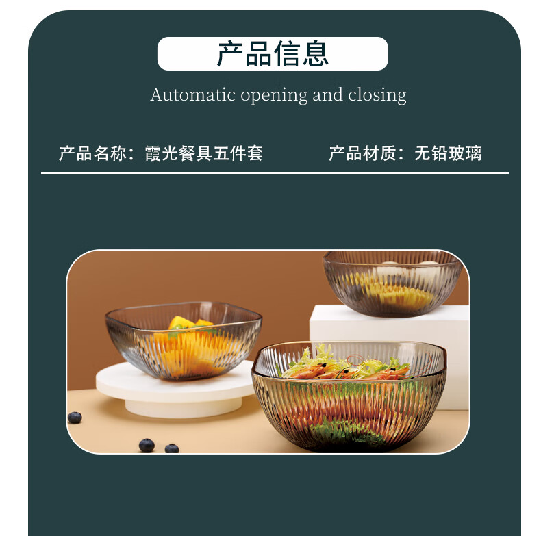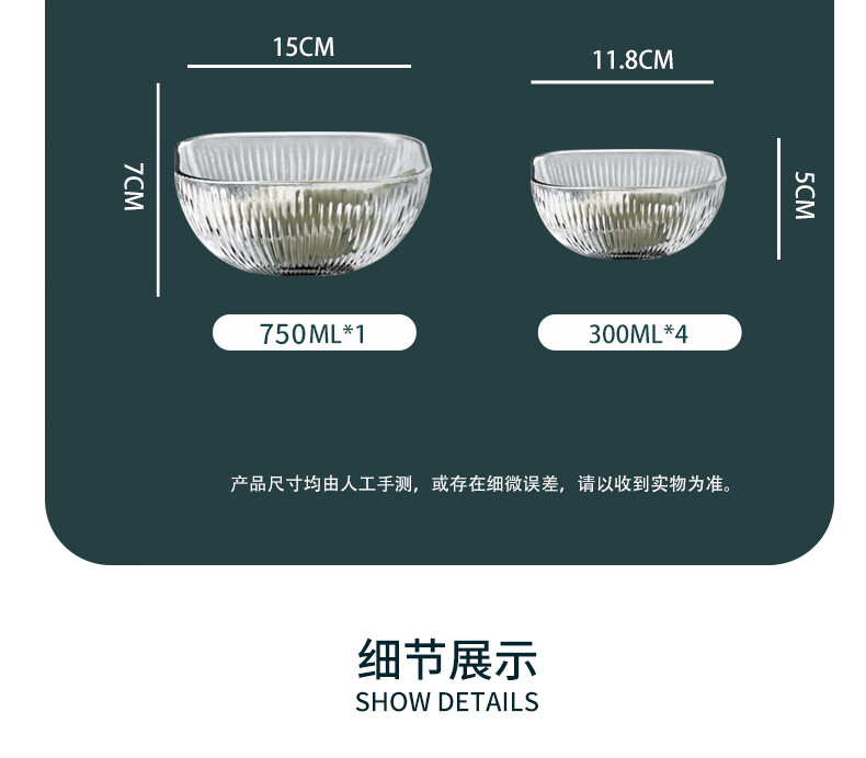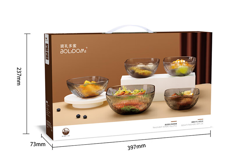 【规格】:10套 /箱 【组合】:大碗750ml*1、小碗330ml*4 【材质】:钠钙玻璃0~60℃ 【彩盒尺寸】:397*73*237mm 【外箱尺寸】:41*38.6*49CM 【毛重】:17 KG