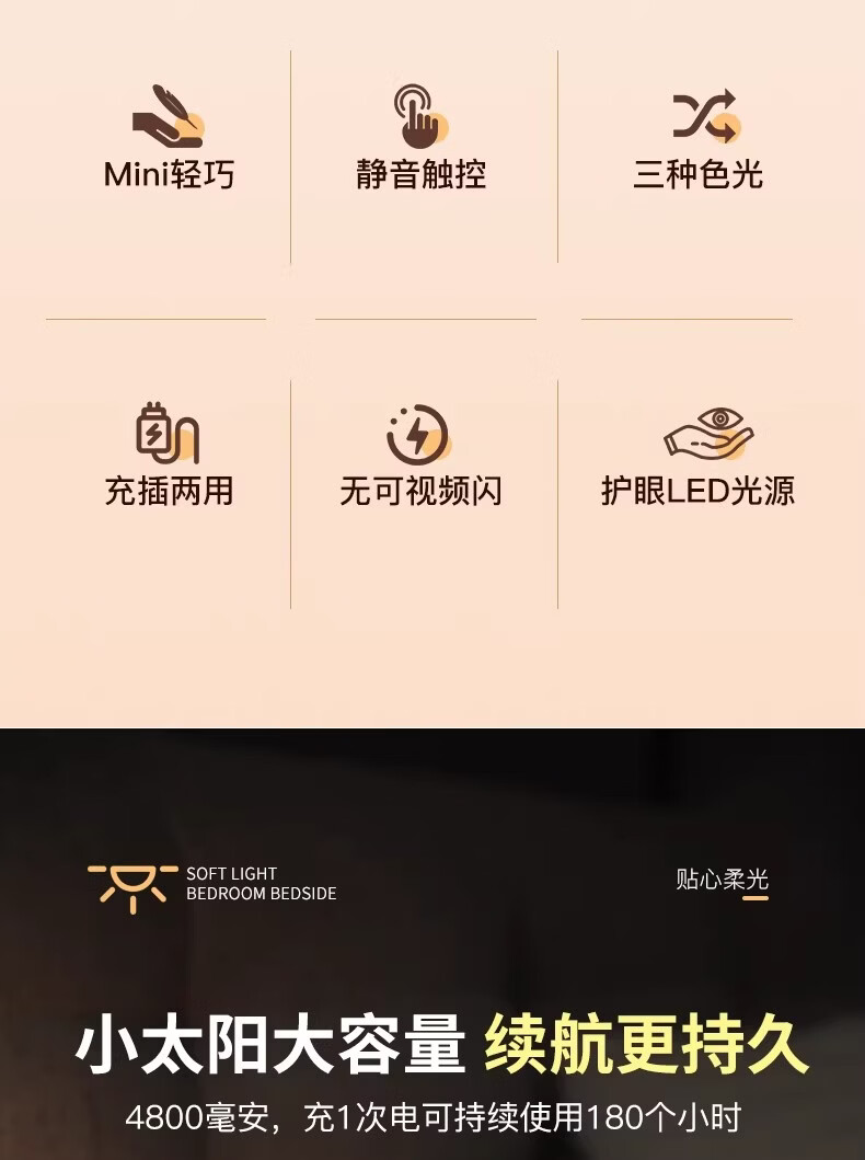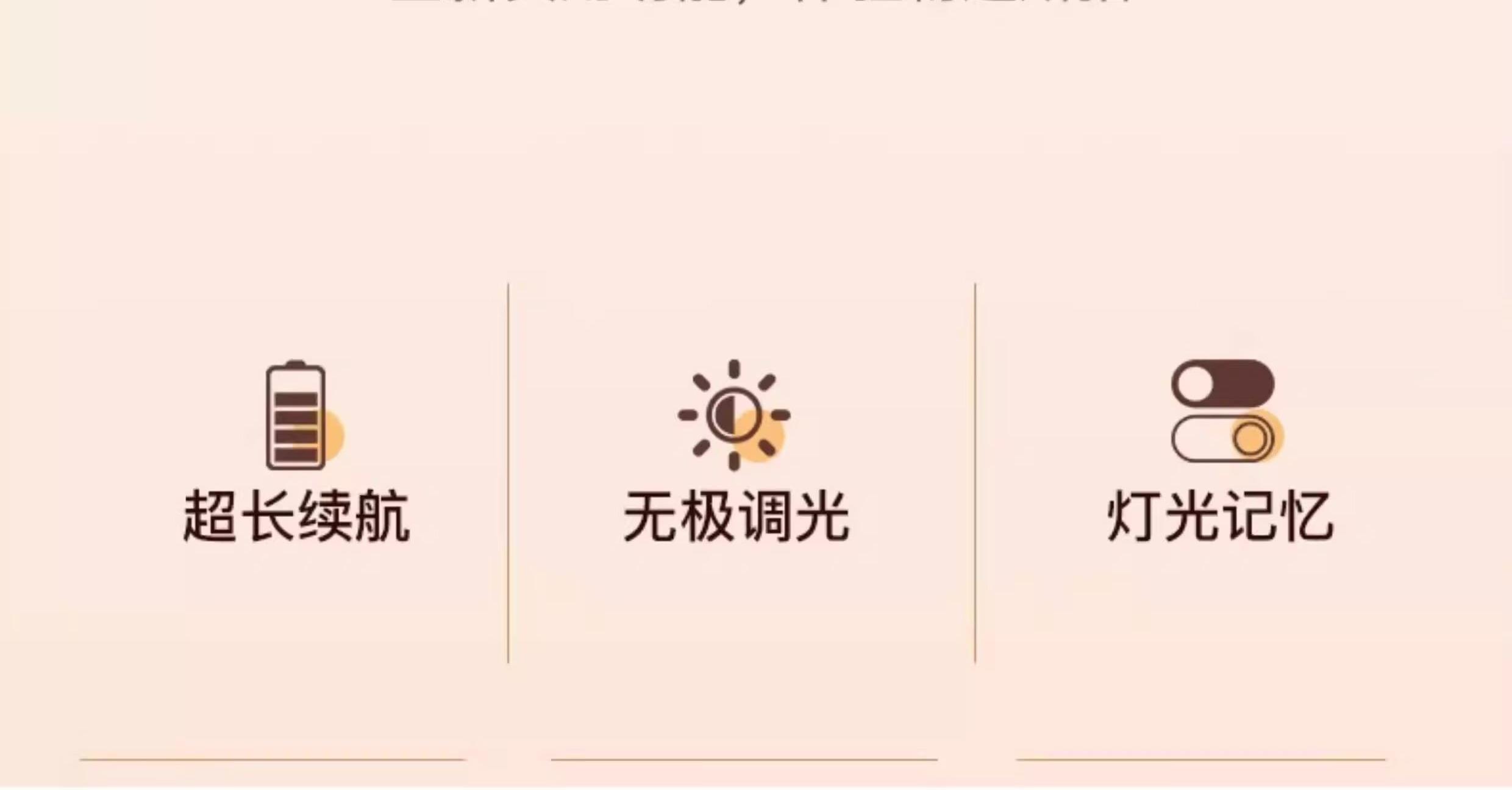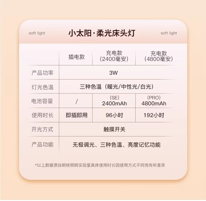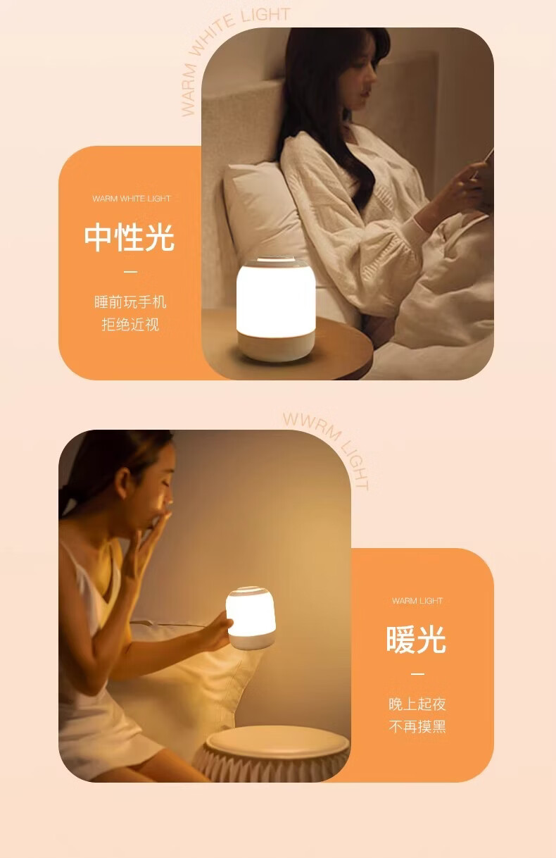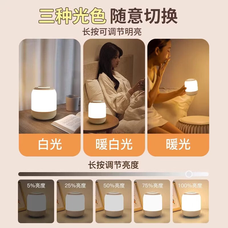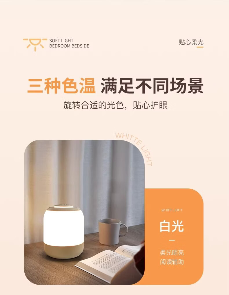 型 号:M02 产品颜色:白色 材 质:ABS+电子元器件 操作方式:触摸 电池容量:2400mAh 色温模式:白光、暖光、中性光 亮度档位:三档 产品尺寸:96.5*96.5*120mm 包装尺寸:110*110*125mm