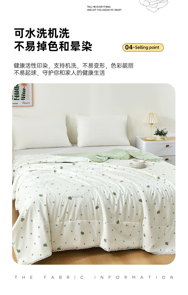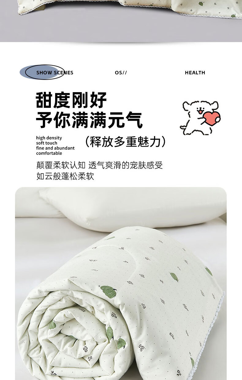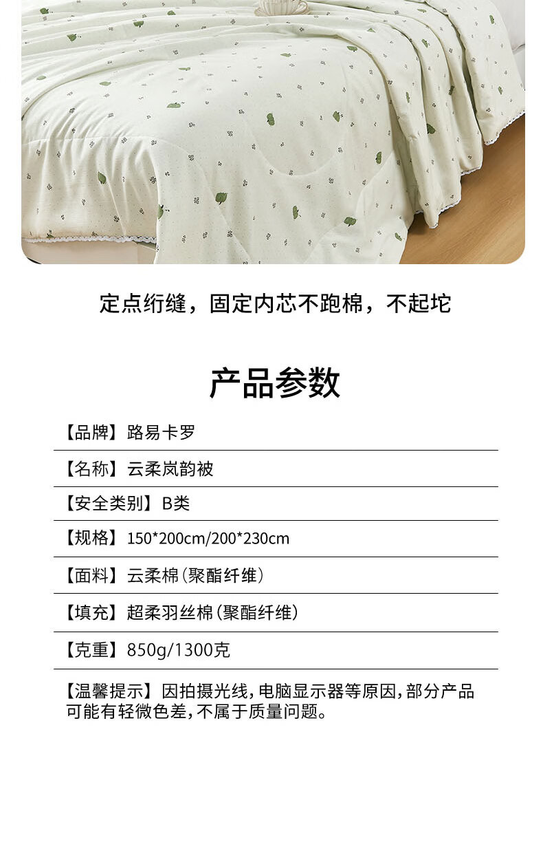 货 号:LK-8527 面 料:云柔棉(聚酯纤维) 填 充:超柔羽丝棉(聚酯纤维) 规 格:200*230cm 克 重:1300克