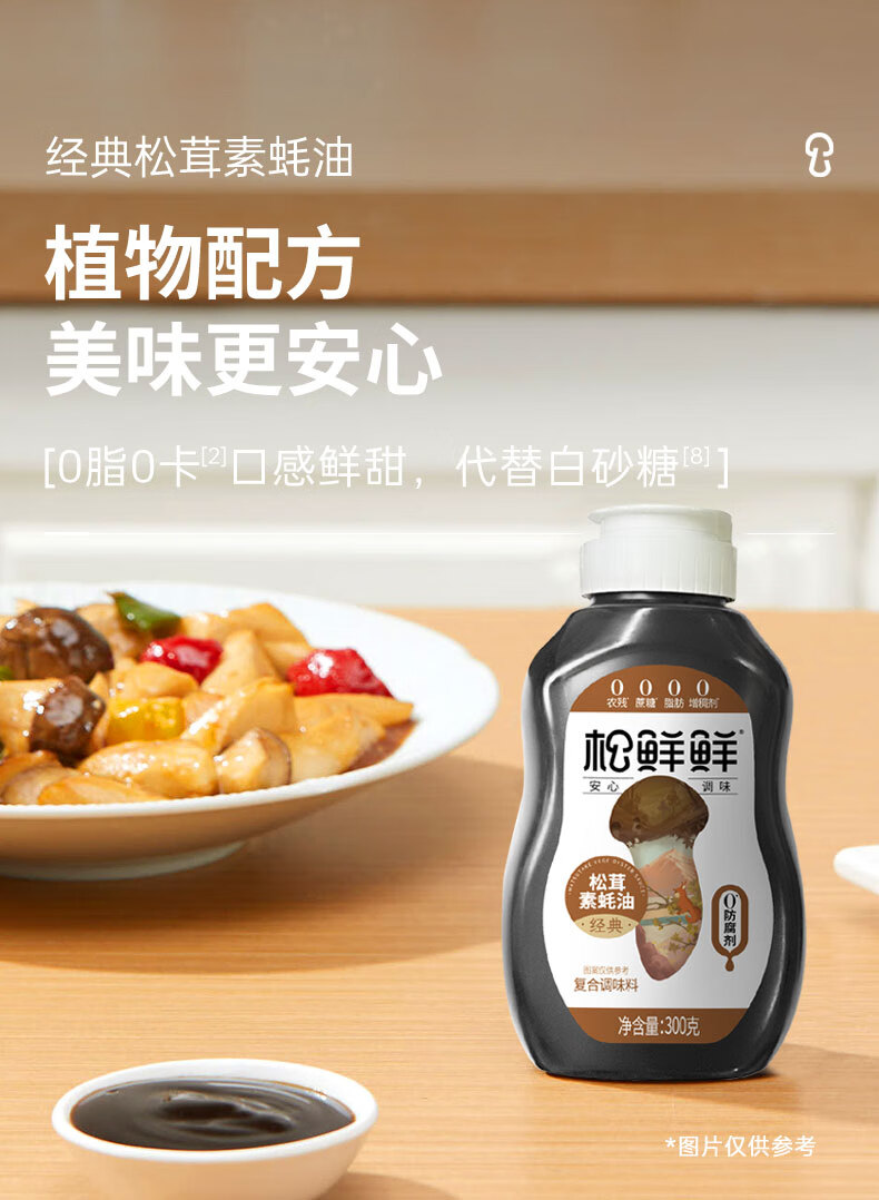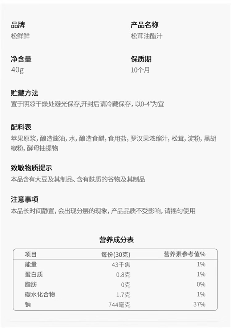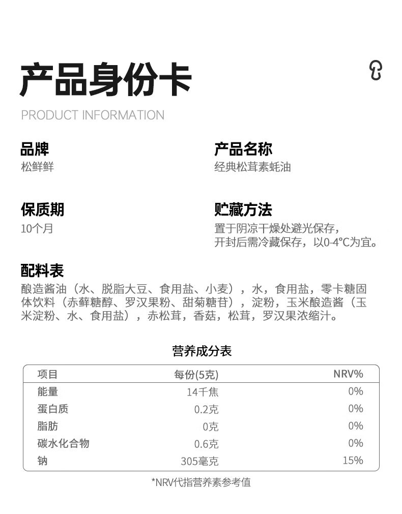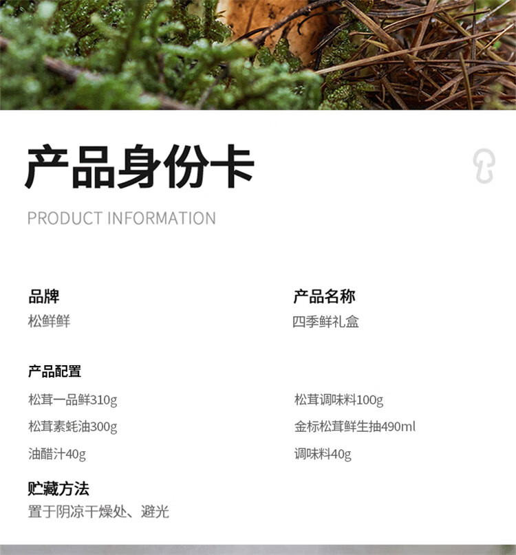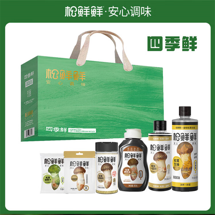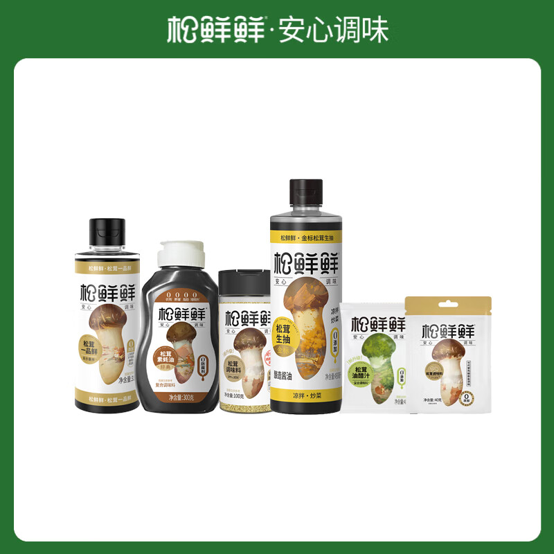 1、松茸一品鲜310g2、松茸调味料100g3、松茸素蚝油300g4、金 标松茸鲜生抽490ml5、油醋汁40g6、调味料40g