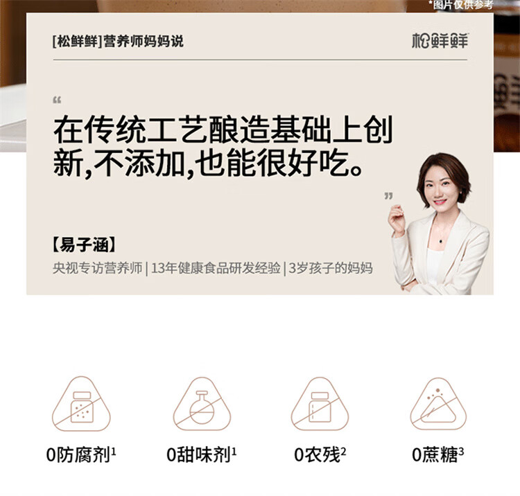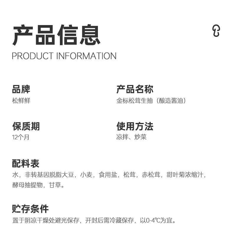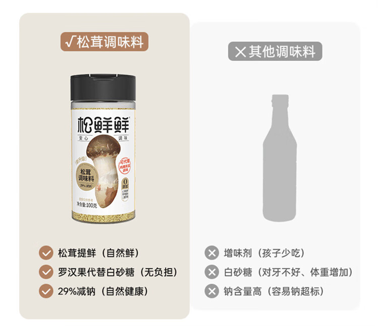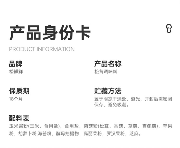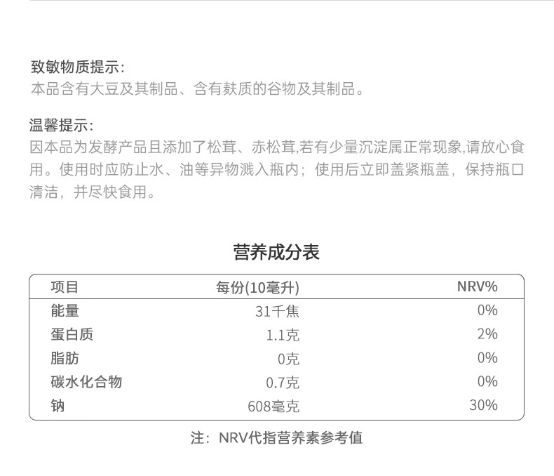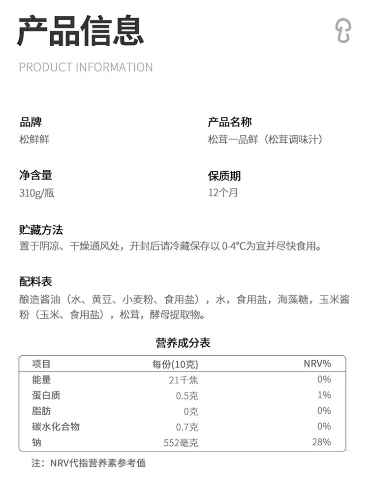1、松茸一品鲜310g2、松茸调味料100g3、松茸素蚝油300g4、金 标松茸鲜生抽490ml5、油醋汁40g6、调味料40g