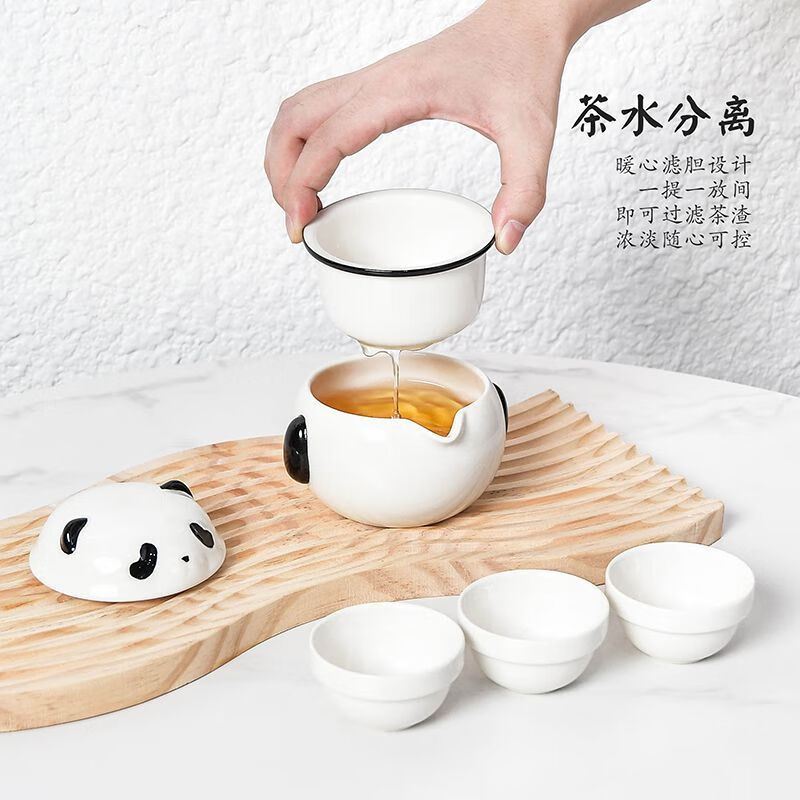 组 建:熊猫泡茶杯*1 茶漏*1 小茶杯*3 产品 尺寸:熊猫泡茶杯宽度10.5cm 高度8cm 小茶杯直径6cm 高度3cm 容 量:熊猫泡茶杯220ml 小杯子40ml 包 装尺寸:13.5*13.5*11.7cm 箱 规:42*42*51cm 装 箱 数:36套