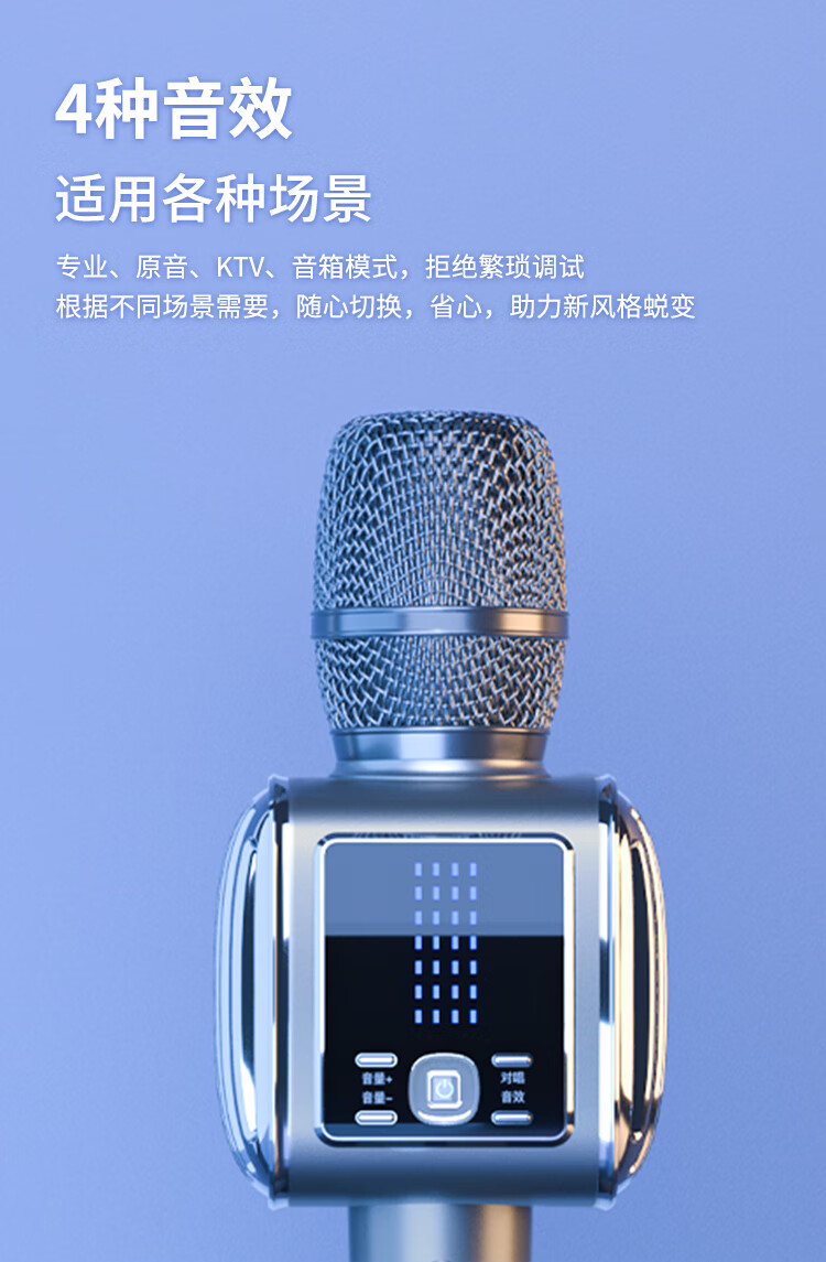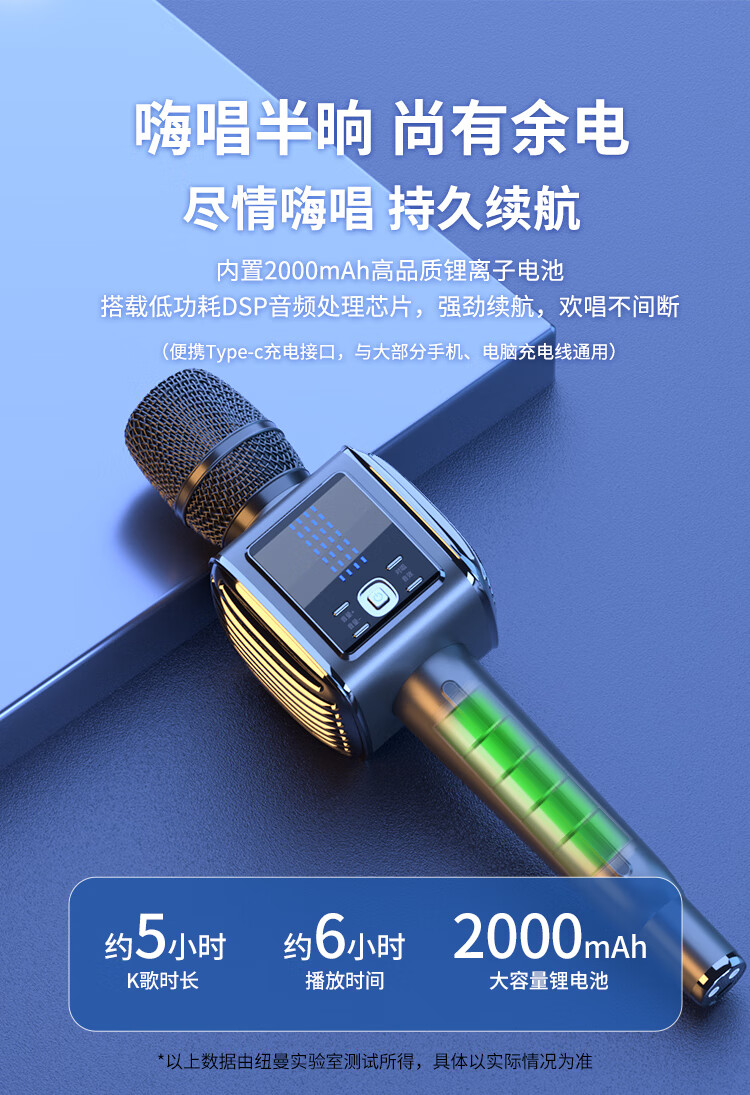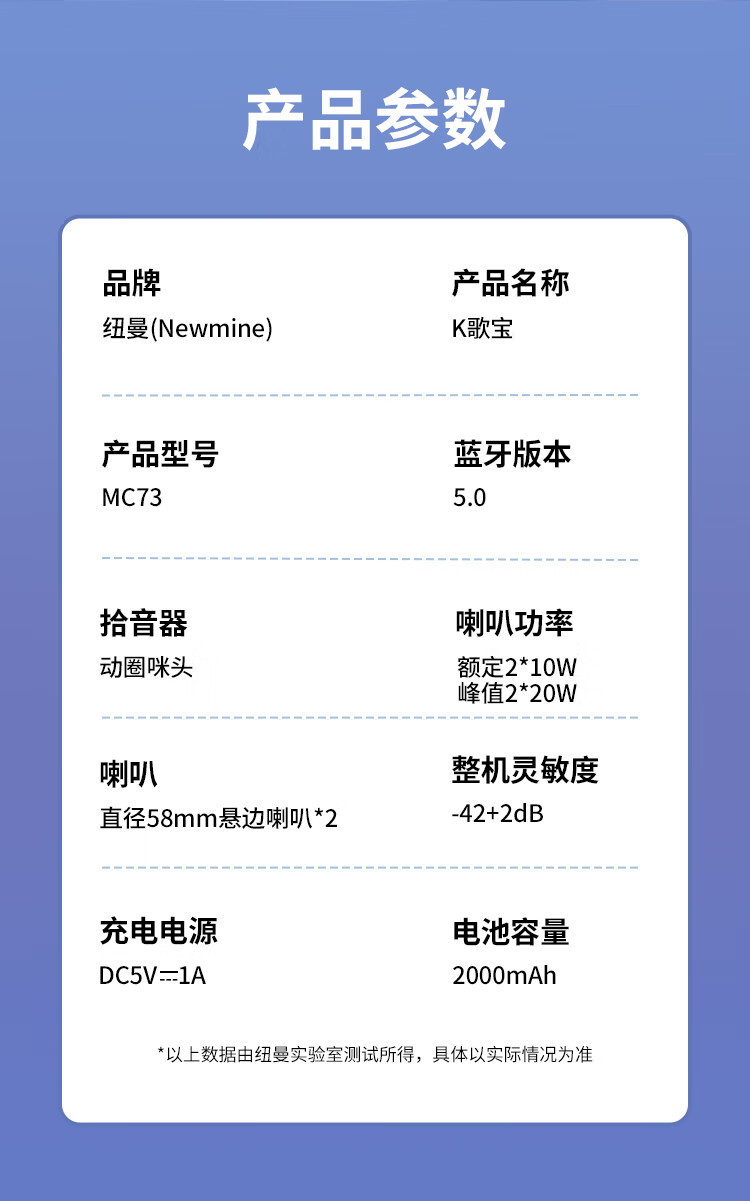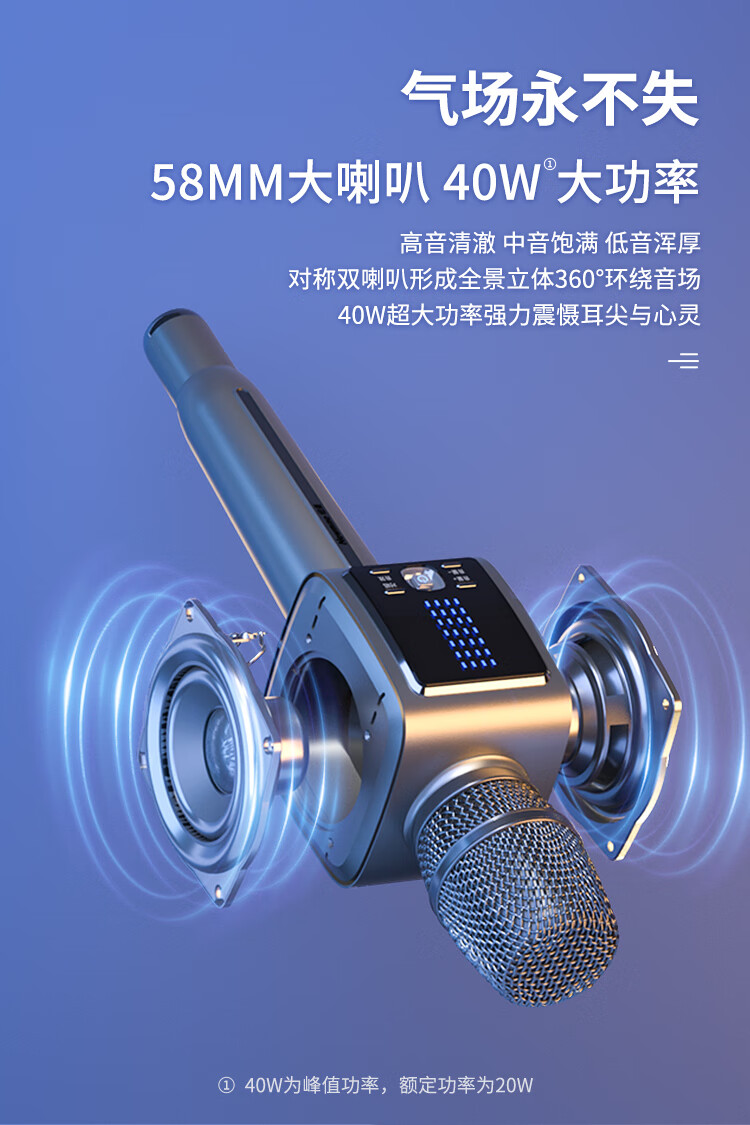 20W超大功率。声音大音质好。双喇叭精品K歌宝;支持多台串联同时K歌。LED大屏显示。 蓝牙:5.0 咪头规格:Φ30mm,动圈咪头。 喇叭尺寸:Φ58mm。 喇叭功率:10W*2, 电池容量:2000mAh, 使用时间:3-6小时。 频响范围:70Hz-10KHz 整机灵敏度:-42±2dB 裸机尺寸:313mm*89mm*85mm 裸机重量:455g 整机重量:895g 外箱尺寸:473*400*400mm 装 箱数量:12个 /箱