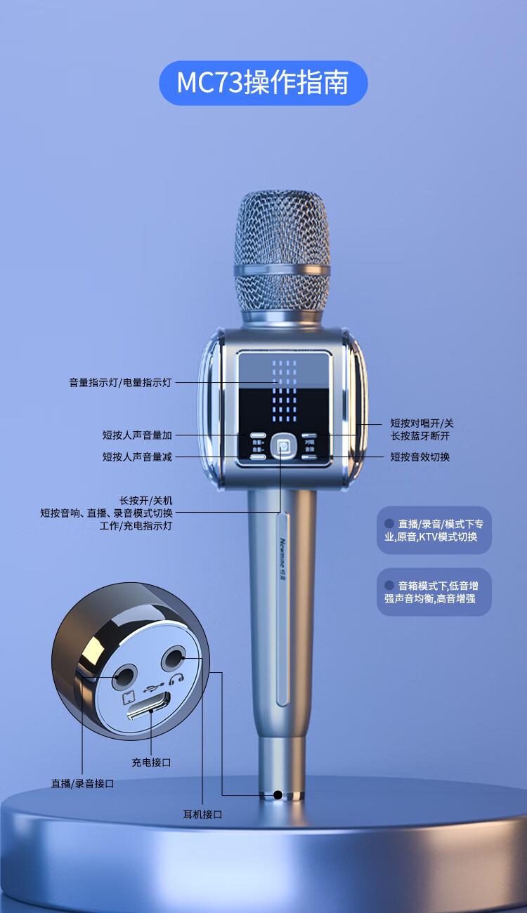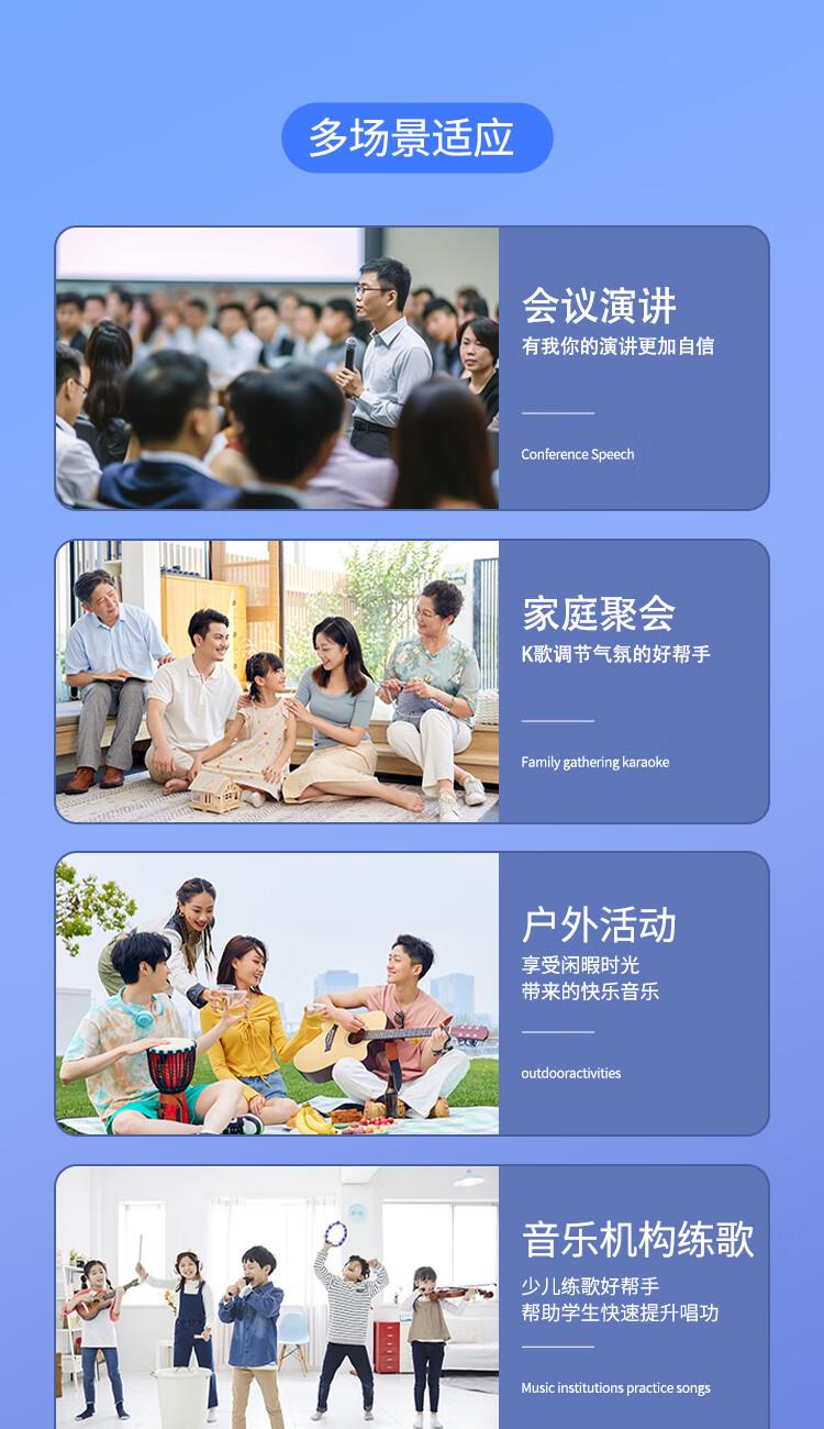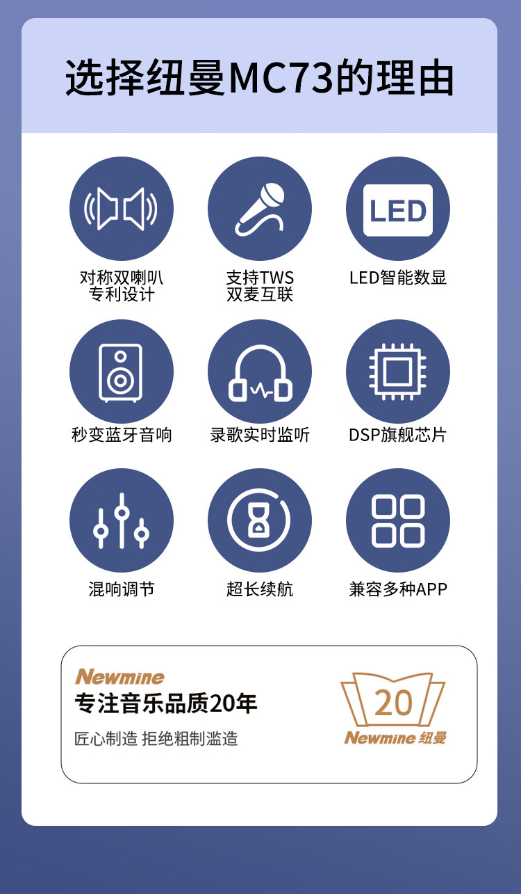 20W超大功率。声音大音质好。双喇叭精品K歌宝;支持多台串联同时K歌。LED大屏显示。 蓝牙:5.0 咪头规格:Φ30mm,动圈咪头。 喇叭尺寸:Φ58mm。 喇叭功率:10W*2, 电池容量:2000mAh, 使用时间:3-6小时。 频响范围:70Hz-10KHz 整机灵敏度:-42±2dB 裸机尺寸:313mm*89mm*85mm 裸机重量:455g 整机重量:895g 外箱尺寸:473*400*400mm 装 箱数量:12个 /箱