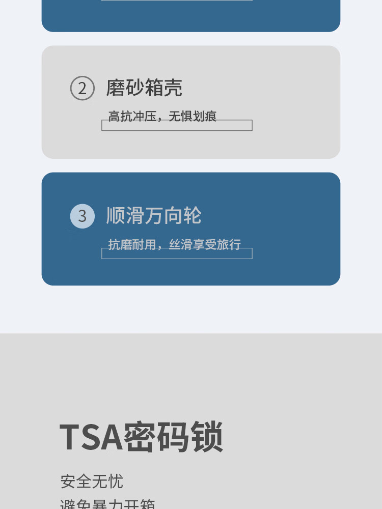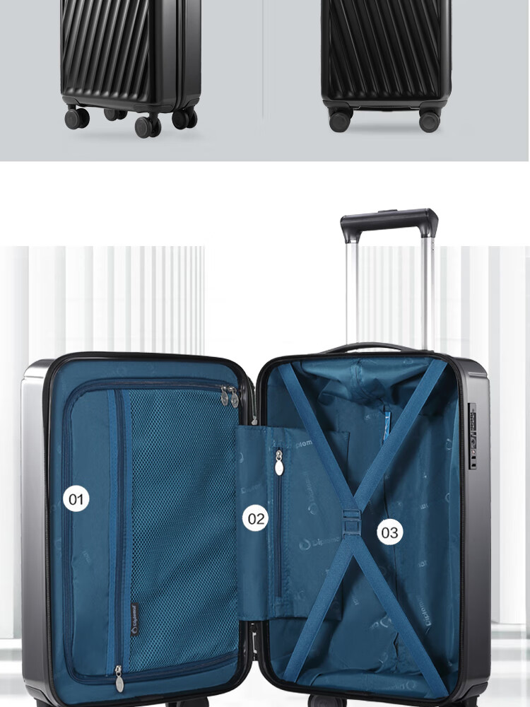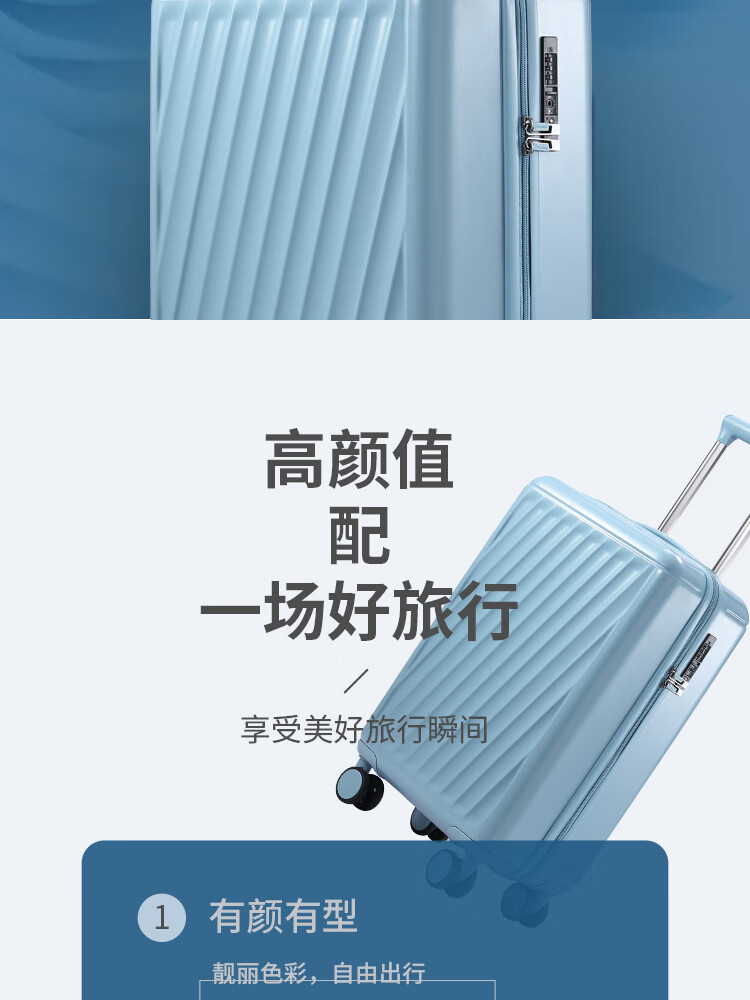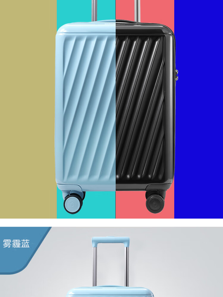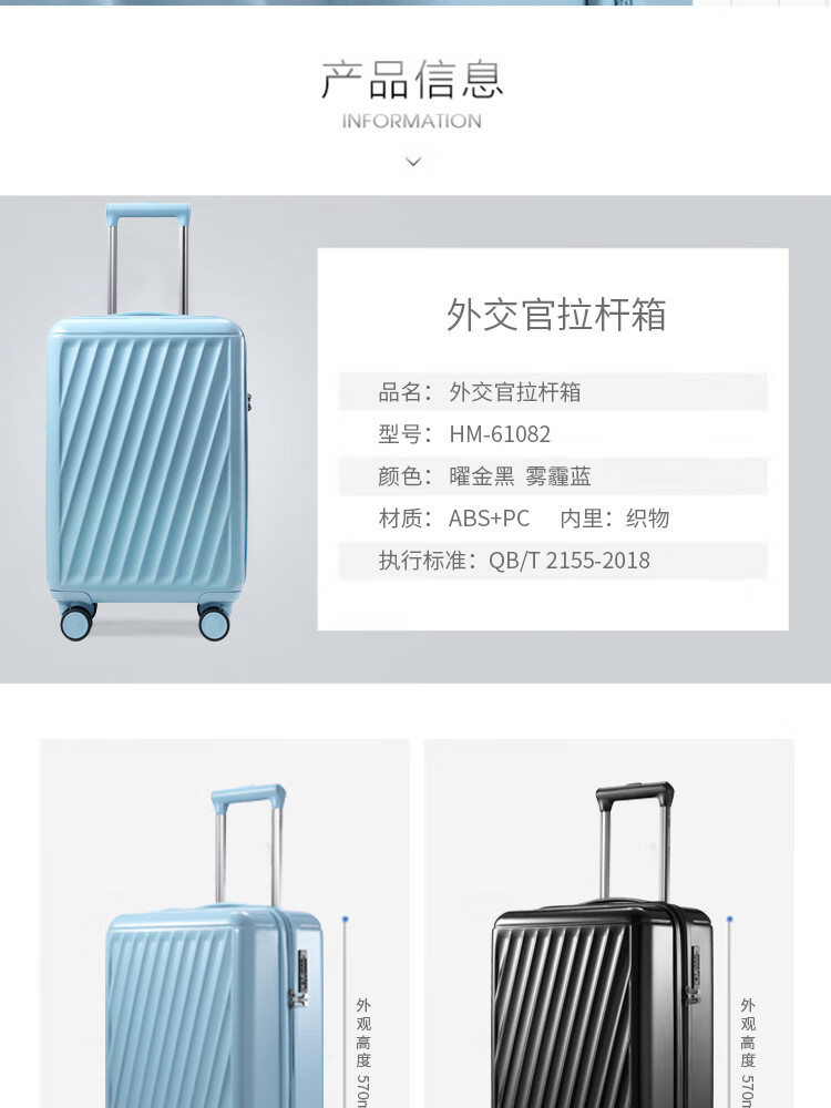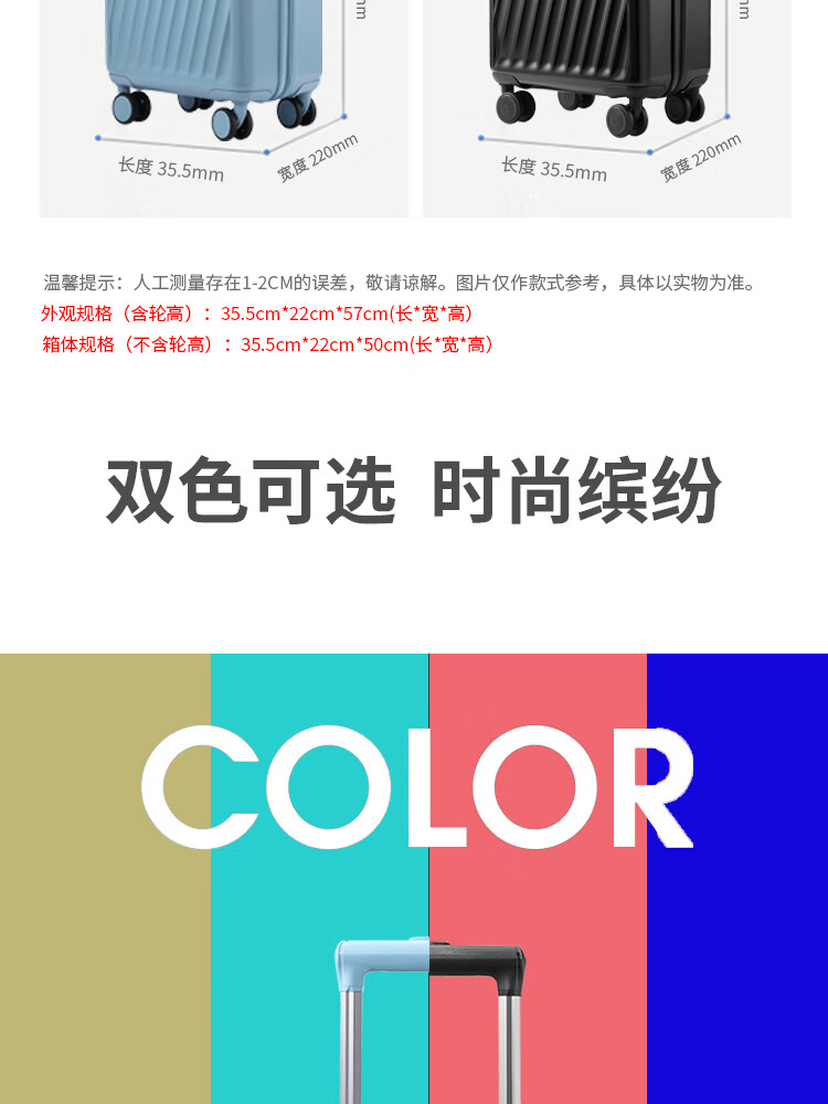 产品材质:ABS+PC 产品颜色:曜金黑(-1)/雾霾蓝(-2) 外观尺寸:355*220*570mm /20英寸 产品条码:6958698322901 /20英寸 6958698322918 /20英寸