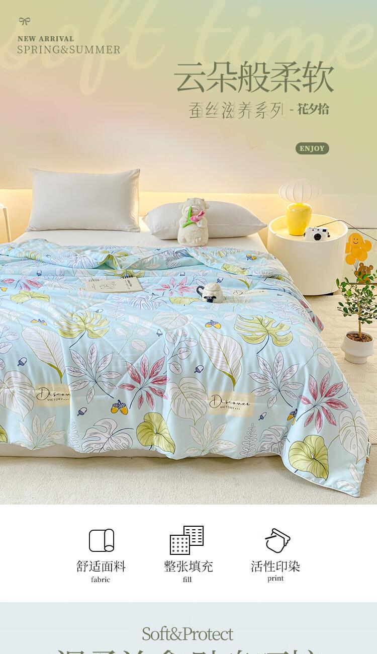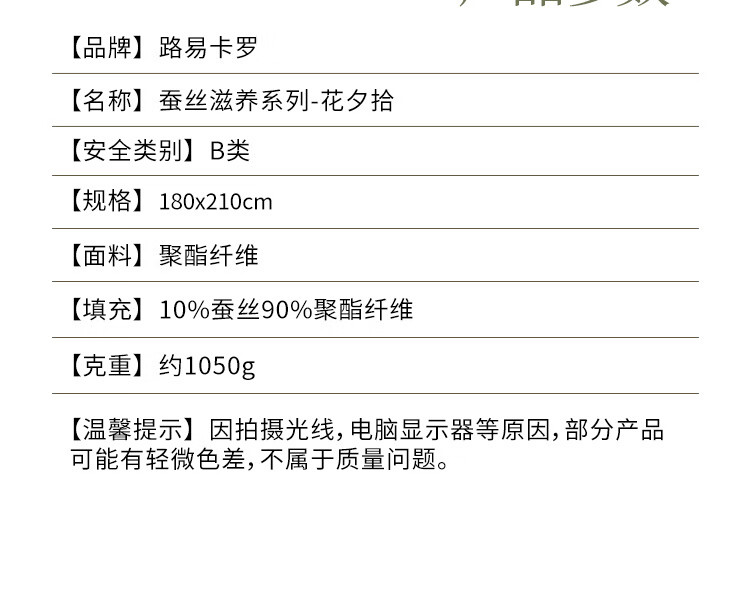 货 号:LK8854 面 料:聚酯纤维 填 充:10%蚕丝/90%聚酯纤维 规 格:180x210cm 克 重:1050克