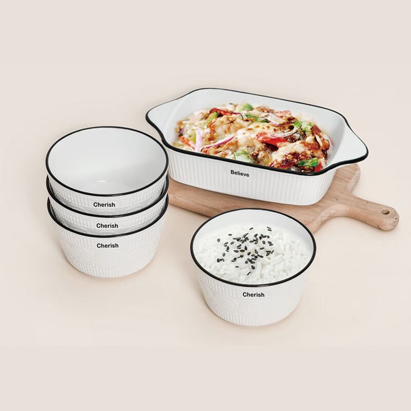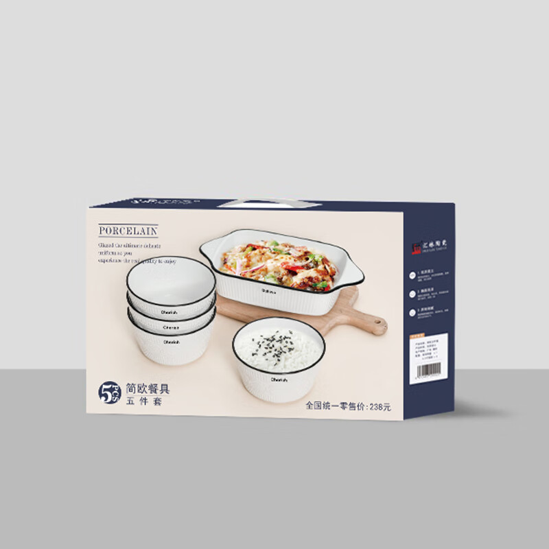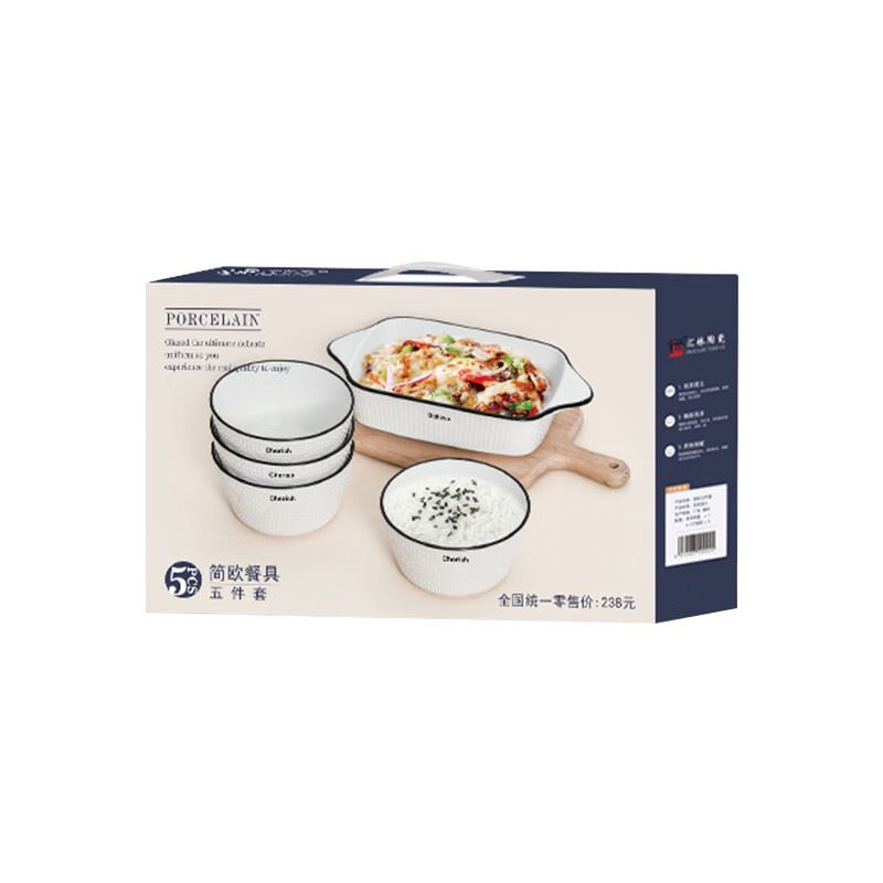 产品规格:双耳烤盘 * 1 4.5寸饭碗 * 4 彩盒尺寸:36.6x24.3x6.8 产品毛重:1975g