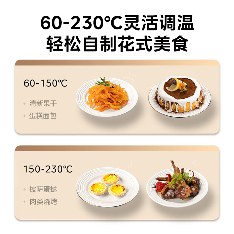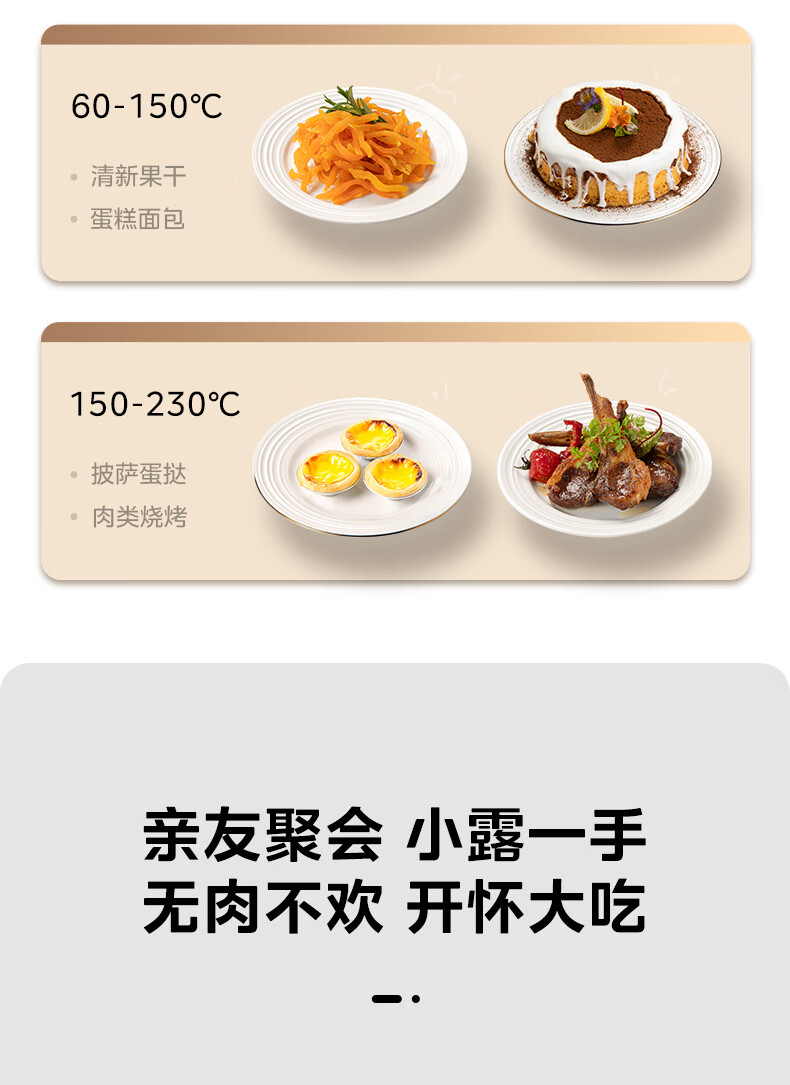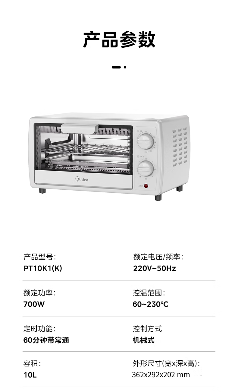 容量:10L 额定功率:800W额定电压:220V 控温范围:60-230℃定时功能:60分钟带长通控制方式:机械式 商品条形码:6944271672761 毛重:2.8 kg包装尺寸:395 x 295 x 235 mm