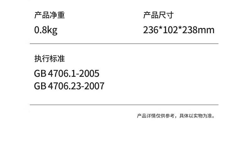 产品尺寸:236*102*238mm 包装尺寸:260*130*280mm 单台净重:0.8kg 单台毛重:1.2kg 产品颜色:米白 装 箱数量:1台/箱 包装材料:电商包