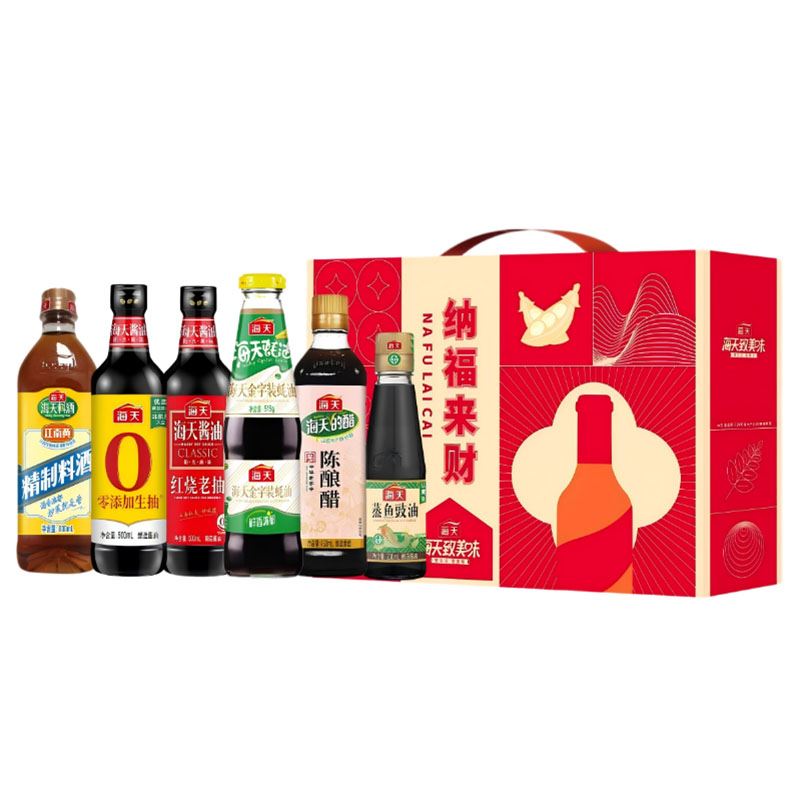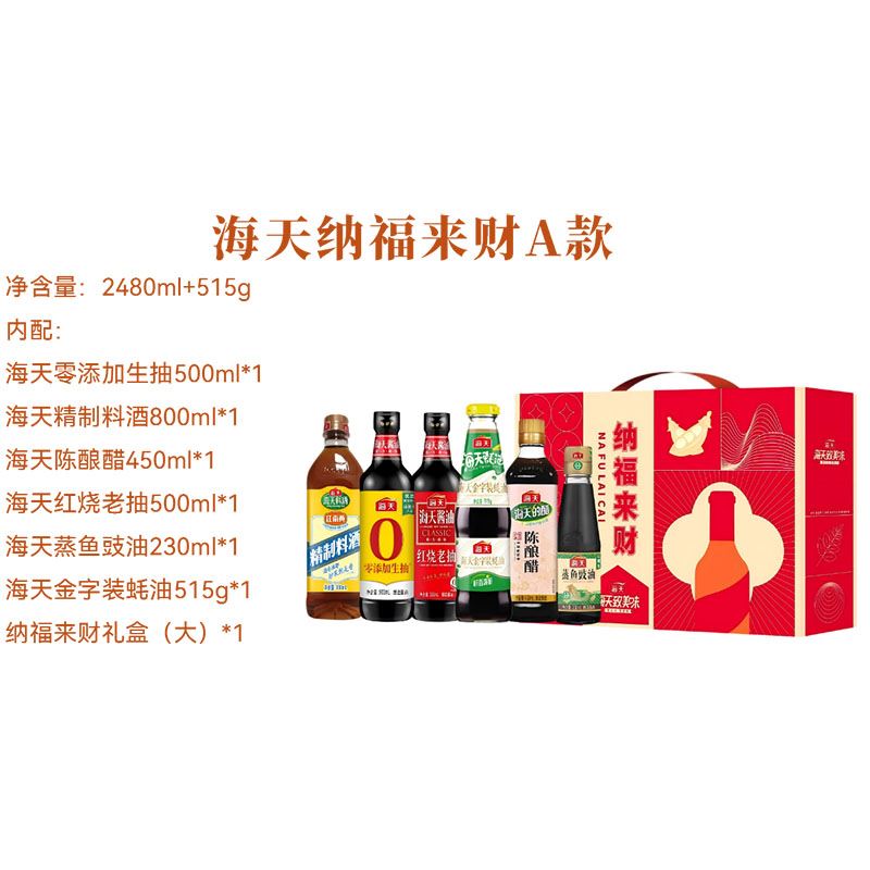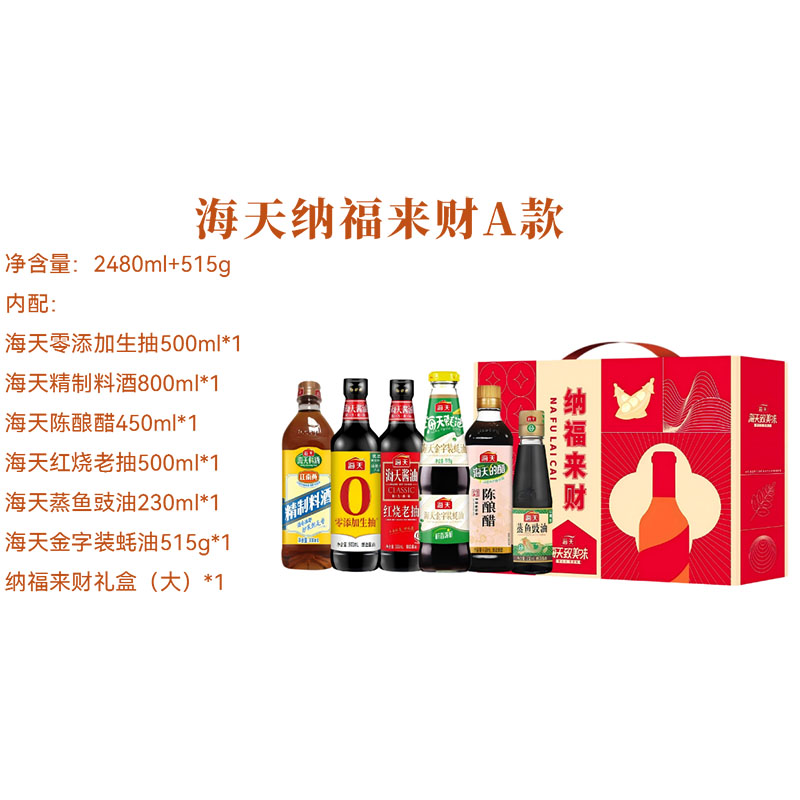 净含量:2480ml+515g 内配: 海天零添加生抽500ml*1 海天精制料酒800ml*1 海天陈酿醋450ml*1 海天红烧老抽500ml*1 海天蒸鱼豉油230ml*1 海天金字装蚝油515g*1 纳福来财礼盒(大)*1