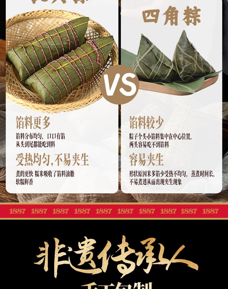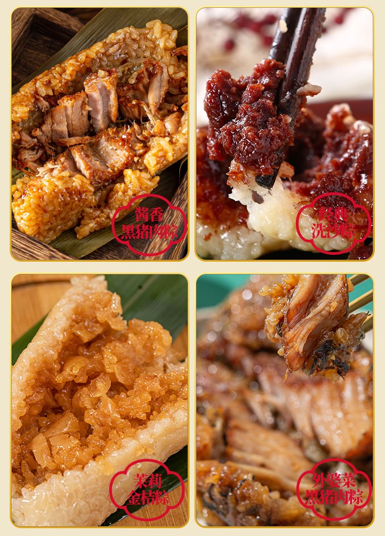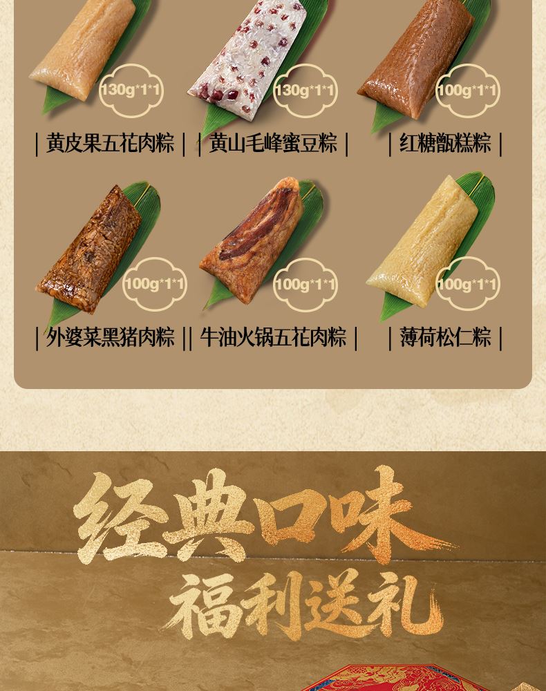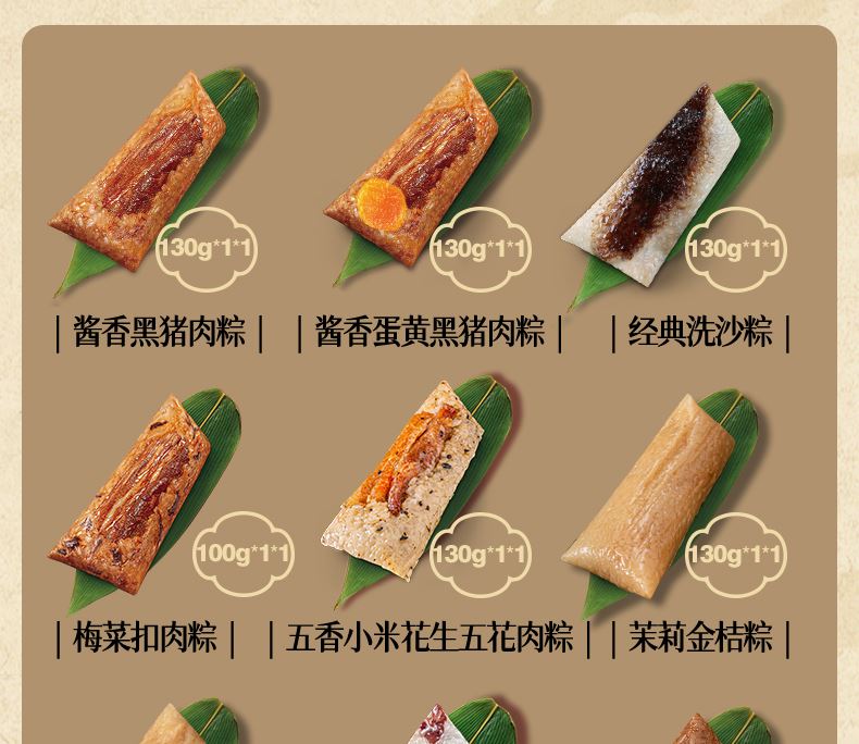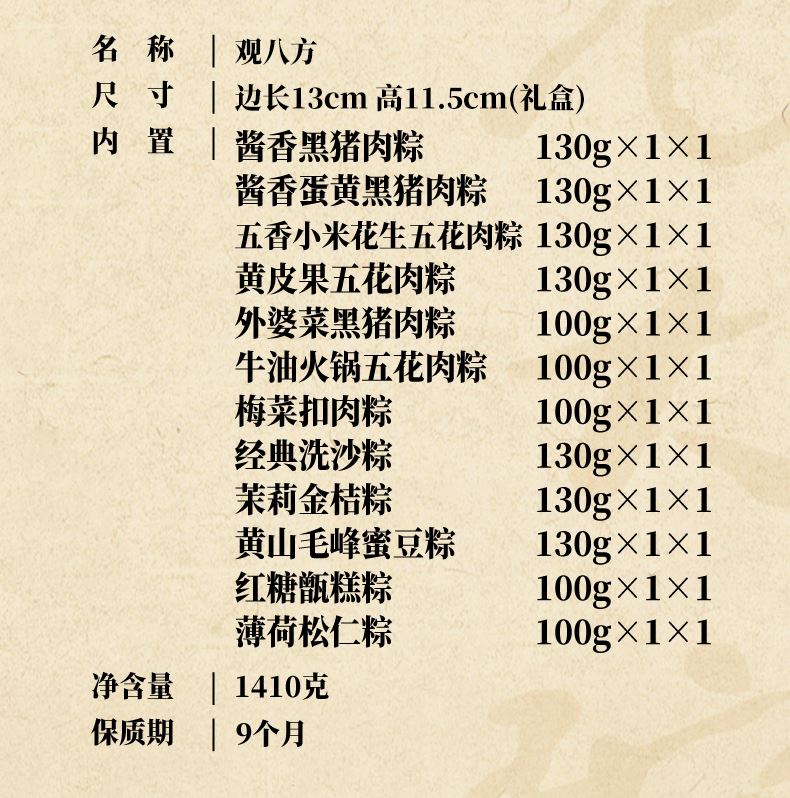 130克*1真空酱香黑猪肉粽 130克*1真空酱香蛋黄黑猪肉粽 130克*1真空五香小米花生五花肉粽 130克*1真空黄皮果五花肉粽 100克*1真空外婆菜黑猪肉粽 100克*1真空牛油火锅五花肉粽 100克*1真空梅菜扣肉粽 130克*1真空经典洗沙粽 130克*1真空茉莉金桔粽 130克*1真空黄山毛峰蜜豆粽 100克*1真空红糖甑糕粽 100克*1真空薄荷松仁粽