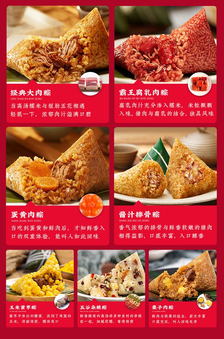 霸王腐乳肉粽260克*1只/袋(枕头粽) 经典大肉粽:140克*1只/袋*2袋 蛋黄鲜肉粽:140克*1只/袋*2袋 酱汁排骨粽:140克*1只/袋*2袋 栗子鲜肉粽:140克*1只/袋*1袋 五谷杂粮粽:140克*1只/袋*2袋 玉米蜜枣粽:140克*1只/袋*2袋