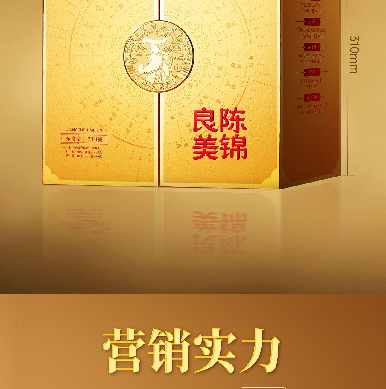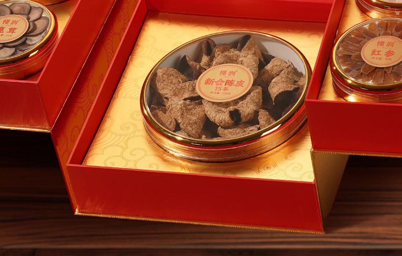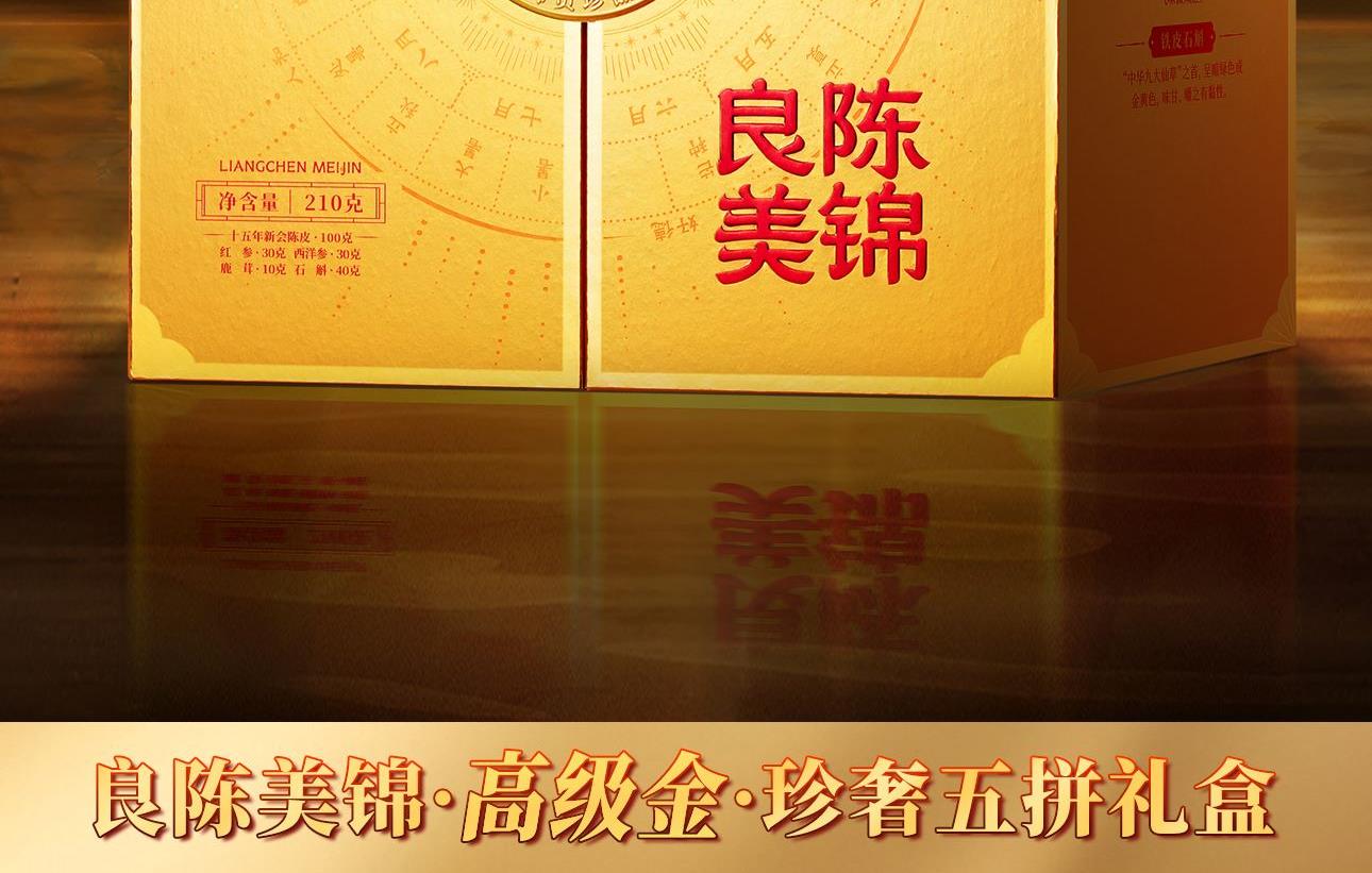 原料: 十五年陈皮100克 红参30克 西洋参30克 鹿茸10克 石斛40克 贮存条件: 通风,避光,干燥处 规格:210克/盒 5盒/件 包装尺寸:尺寸:290*310*147mm