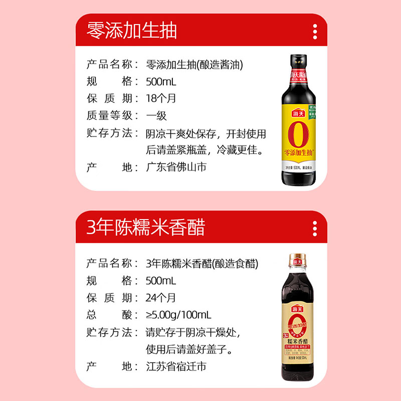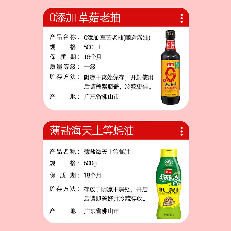 净含量:2200ml+235g 内配: 海天小磨芝麻香油200ml*1 海天0添加生抽500ml*1 海天0添加草菇老抽500ml*1 零添加3年陈糯米香醋500ml*1 海天古道料酒500mL*1 海天上等蚝油235g*1