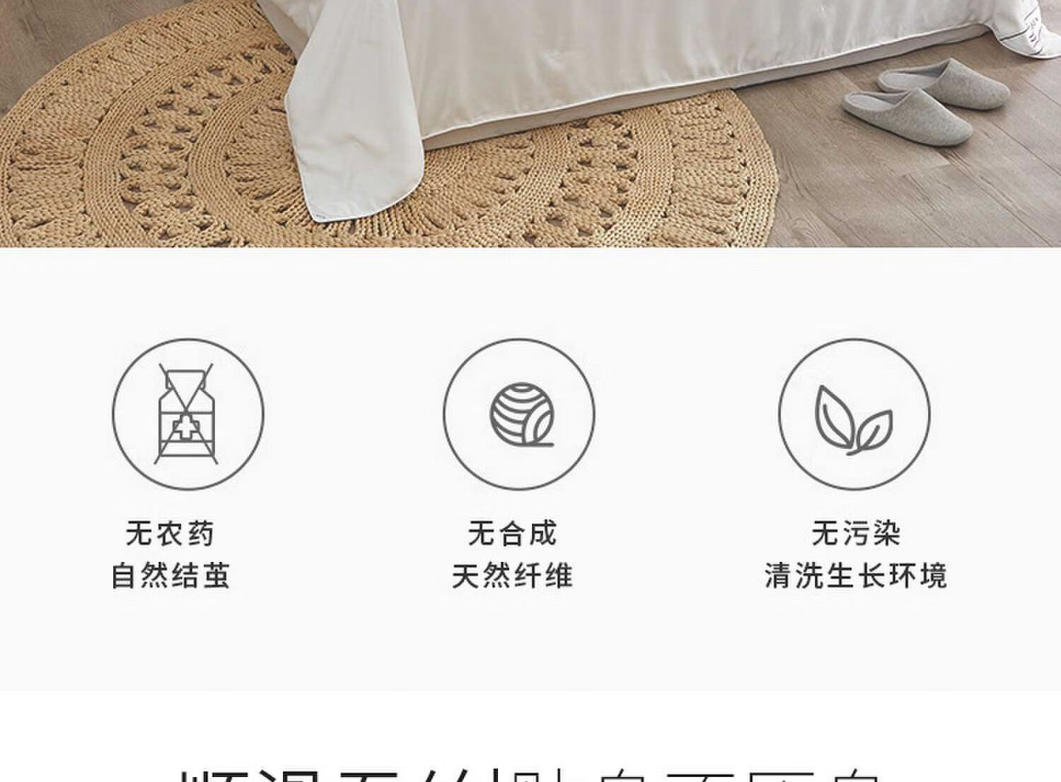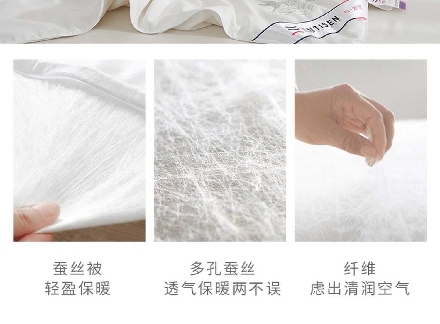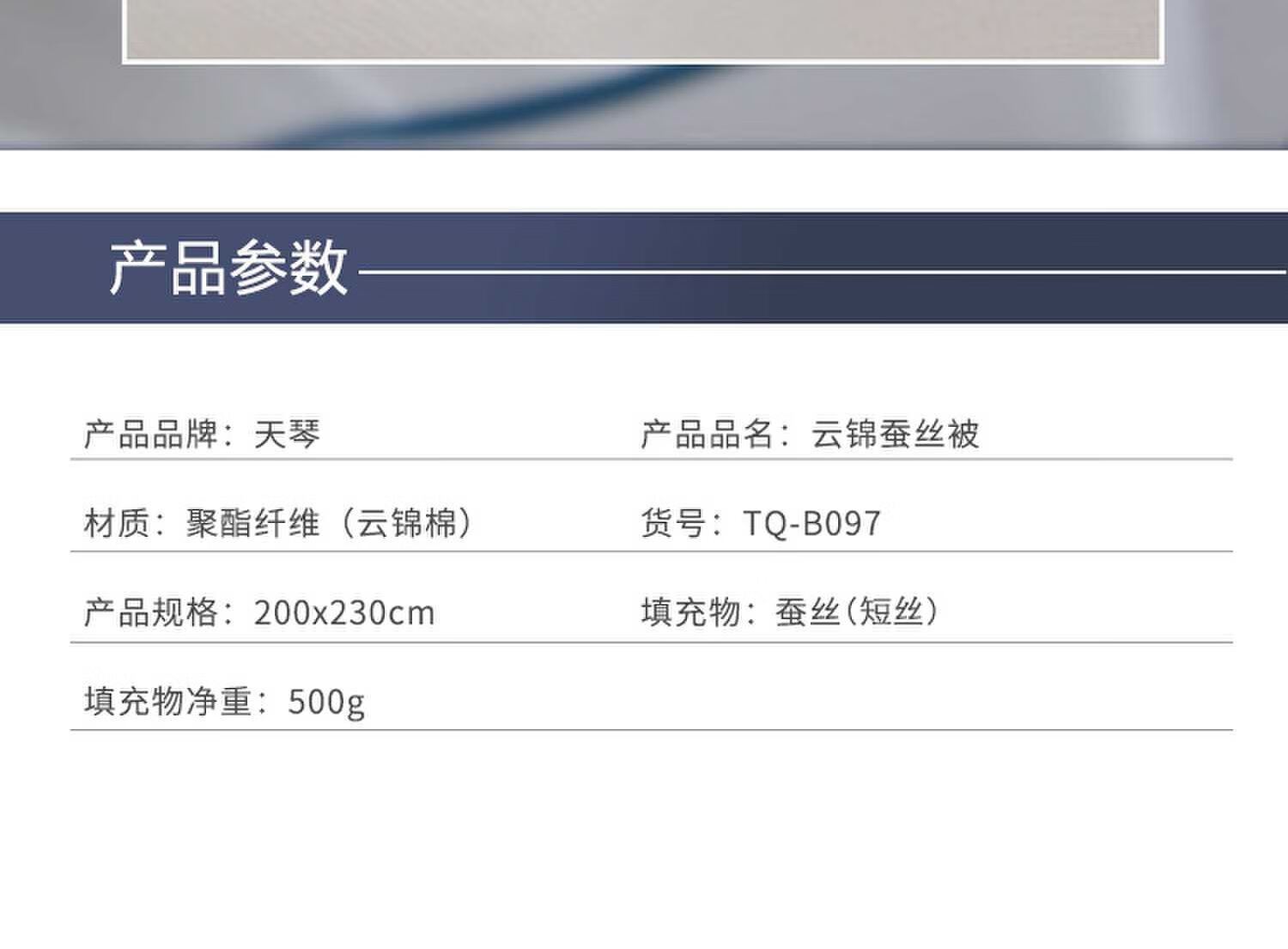 规格:200x230cm 材质:聚酯纤维(云锦棉) 填充物:桑蚕丝 填充物净重:500g