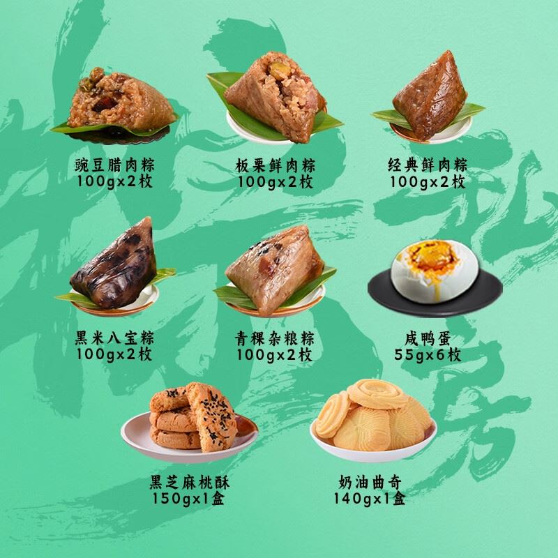 豌豆腊肉粽 100g*2枚 板栗鲜肉粽 100g*2枚 经典鲜肉粽 100g*2枚 黑米八宝粽 100g*2枚 青稞杂粮粽 100g*2枚 咸鸭蛋 55g*6枚*1盒 黑芝麻桃酥 150g*1盒 奶油曲奇 140g*1袋