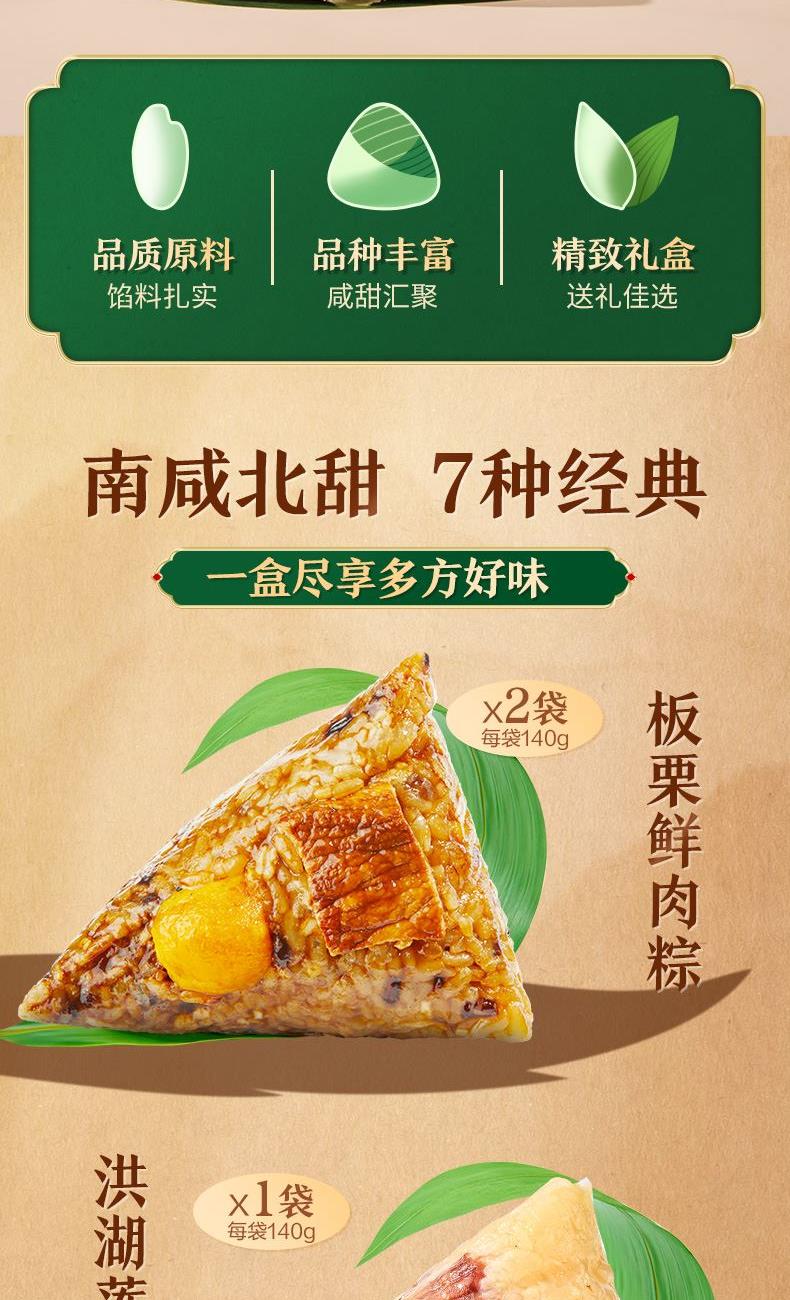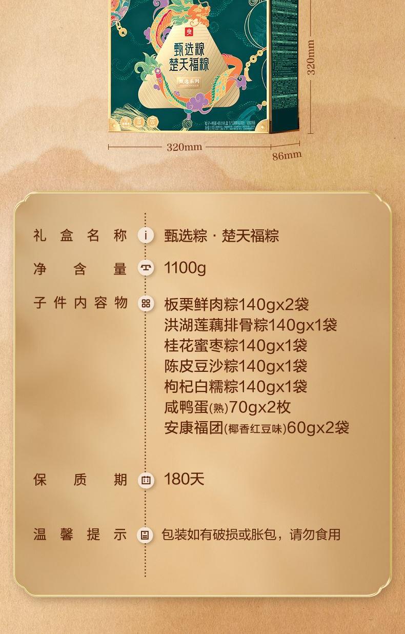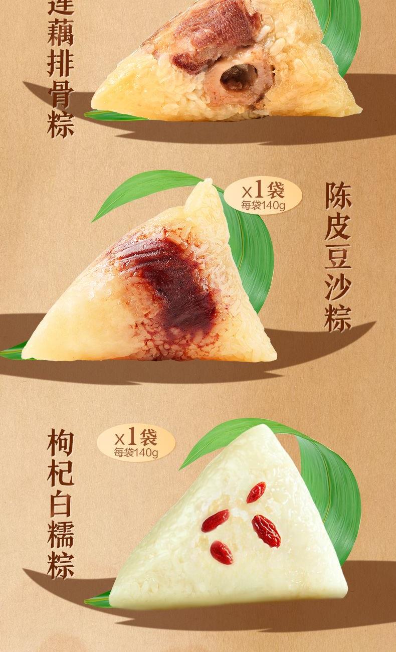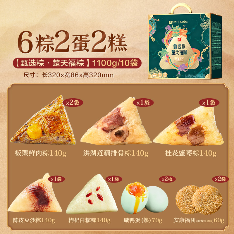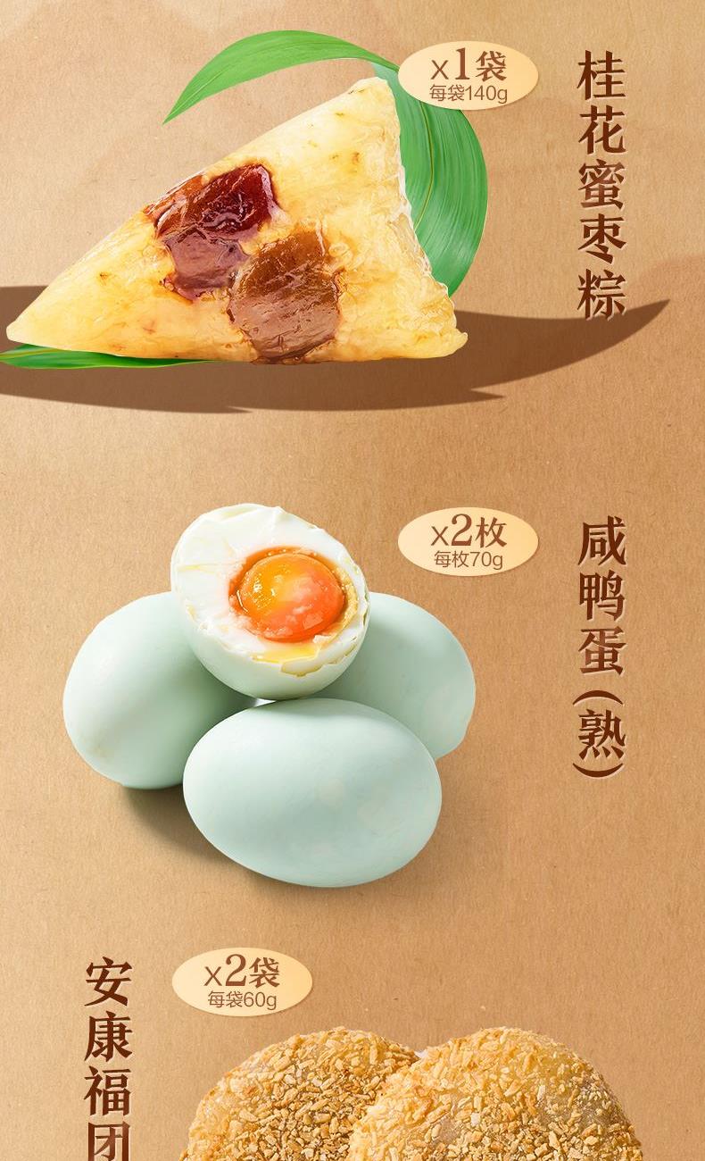 板栗鲜肉粽140g*2 洪湖莲藕排骨粽140g*1 桂花蜜枣粽140g*1 陈皮豆沙粽140g*1 枸杞白糯粽140g*1 咸鸭蛋(熟)70g*2 安康福团(椰香红豆味)60g*2