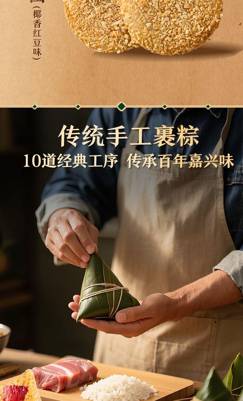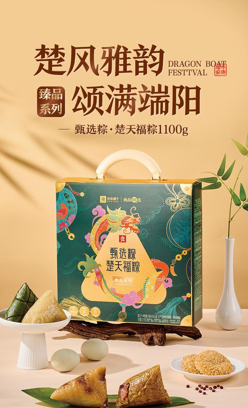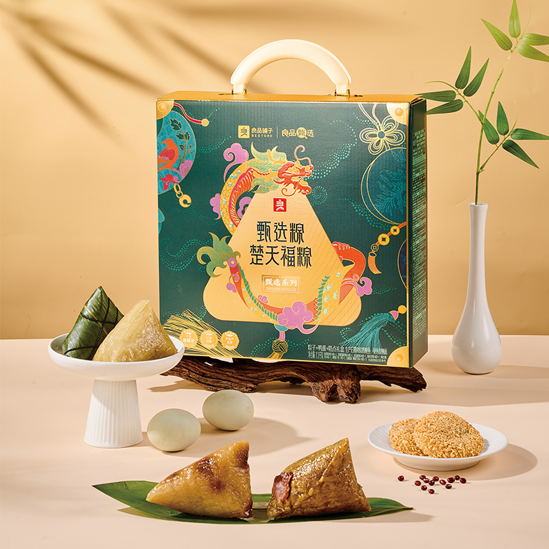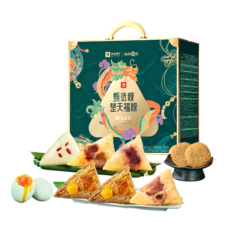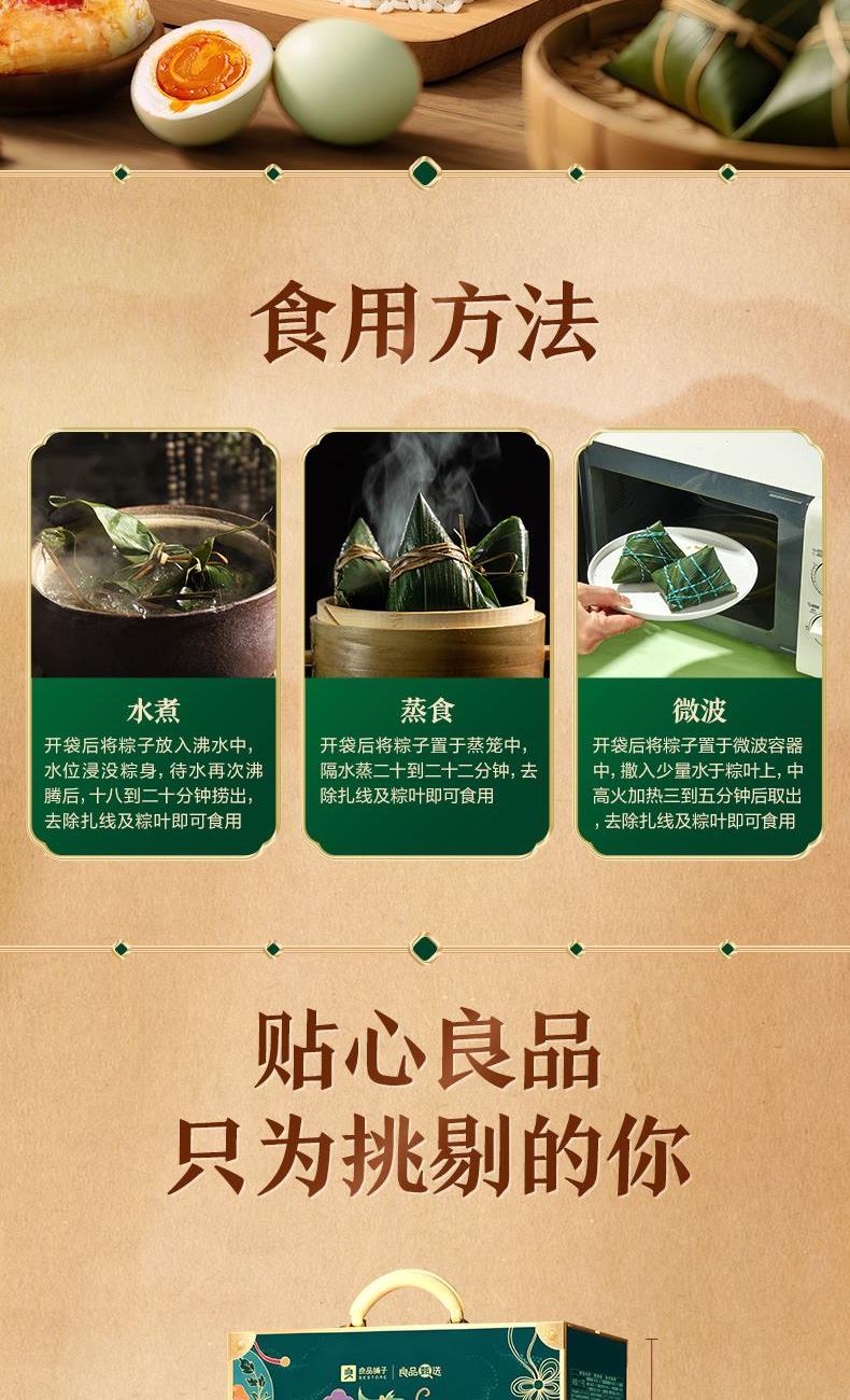 板栗鲜肉粽140g*2 洪湖莲藕排骨粽140g*1 桂花蜜枣粽140g*1 陈皮豆沙粽140g*1 枸杞白糯粽140g*1 咸鸭蛋(熟)70g*2 安康福团(椰香红豆味)60g*2