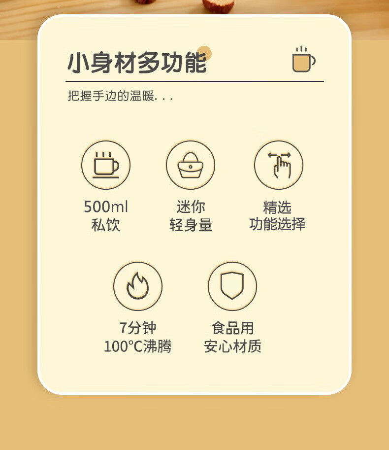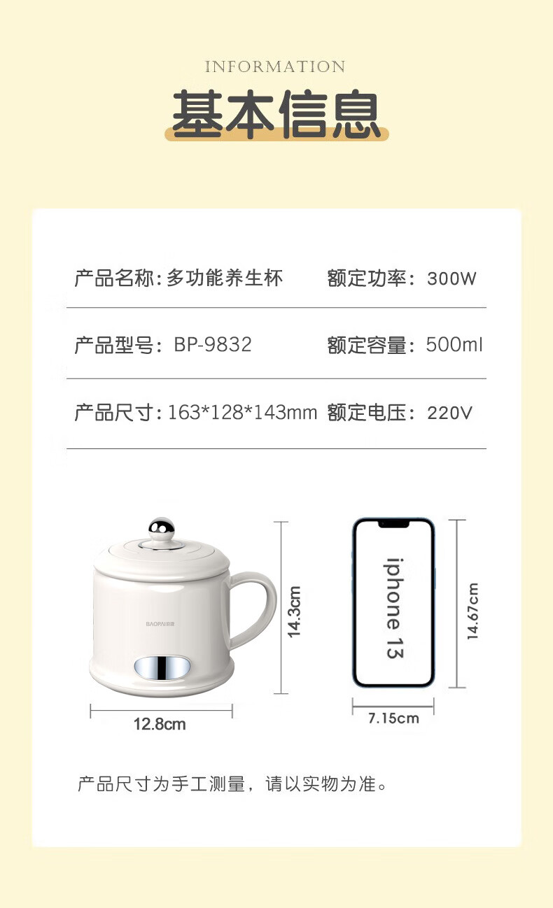 产品材质:PP+不锈钢+陶瓷釉 额定容量:500ml 额定功率:300W 额定电压:220V~ 额定频率:50Hz 毛重/净重:0.4kg/0.6kg 产品尺寸:163*128*143mm 彩盒尺寸:151*131*151mm 装 箱 数量: 24 PCS 外箱尺寸: 5*5*0mm