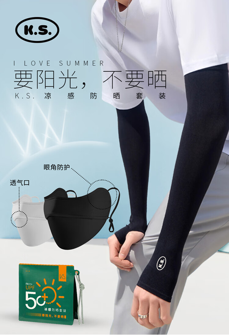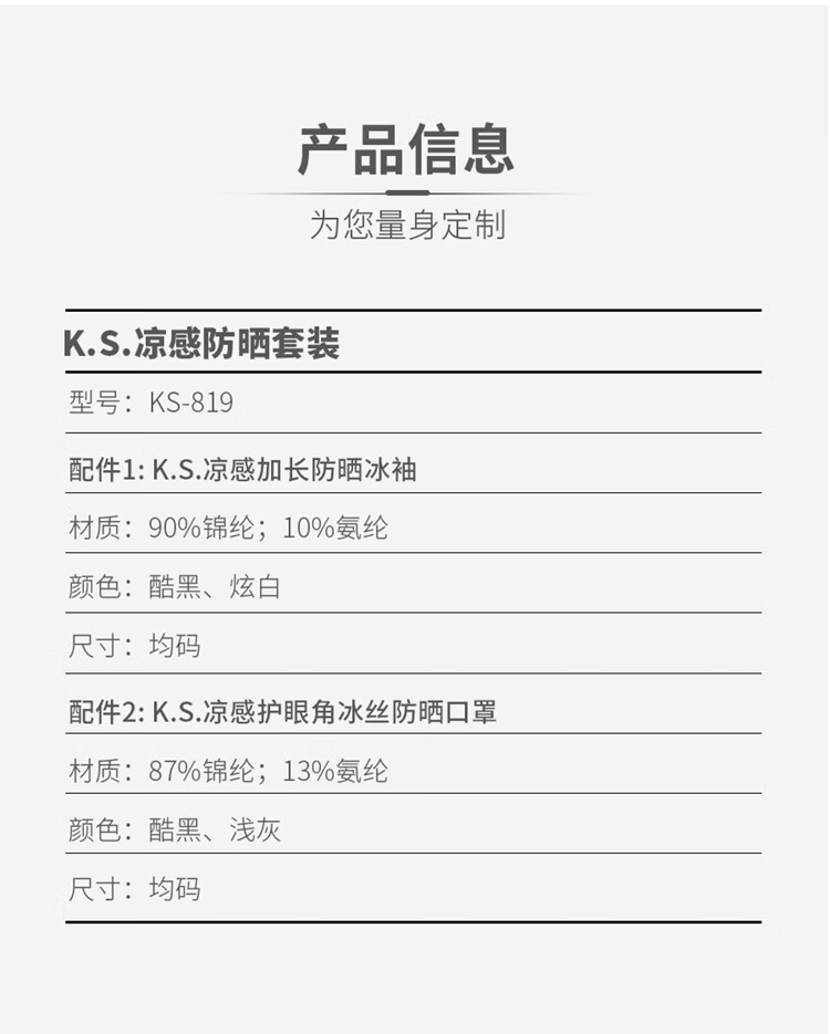 配置:防晒口罩(KS-1093)*1, 长冰袖*1(一套) 材质:冰袖 /锦纶; 氨纶 口罩/ 锦纶+氨纶 颜色组:1.玄英黑/炫白 2.浅灰/酷黑 3.暮灰色/雾蓝 包装:彩盒