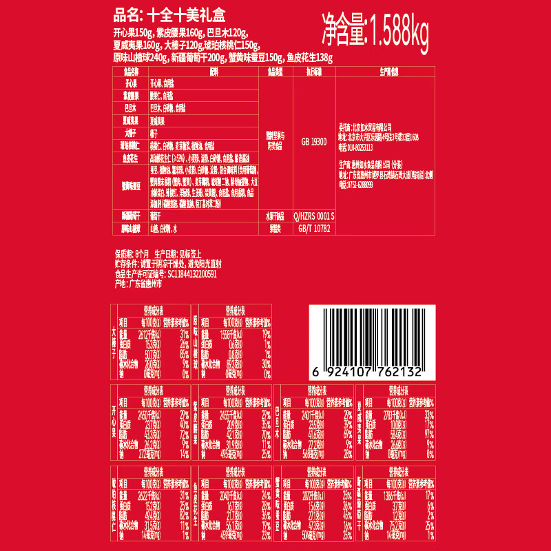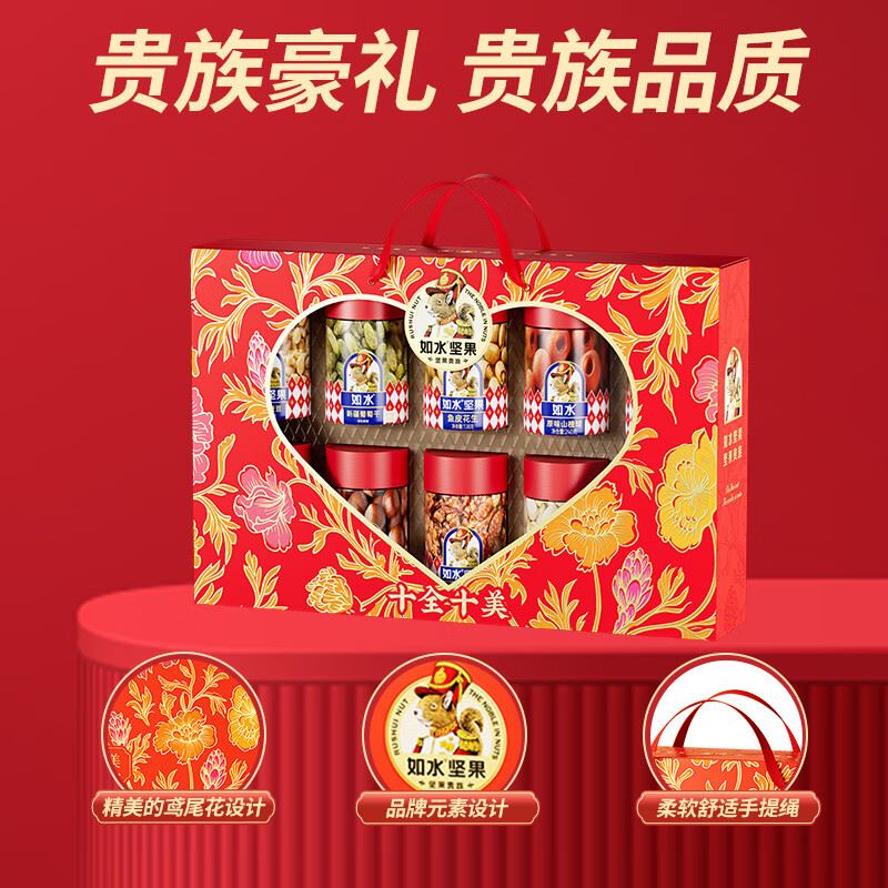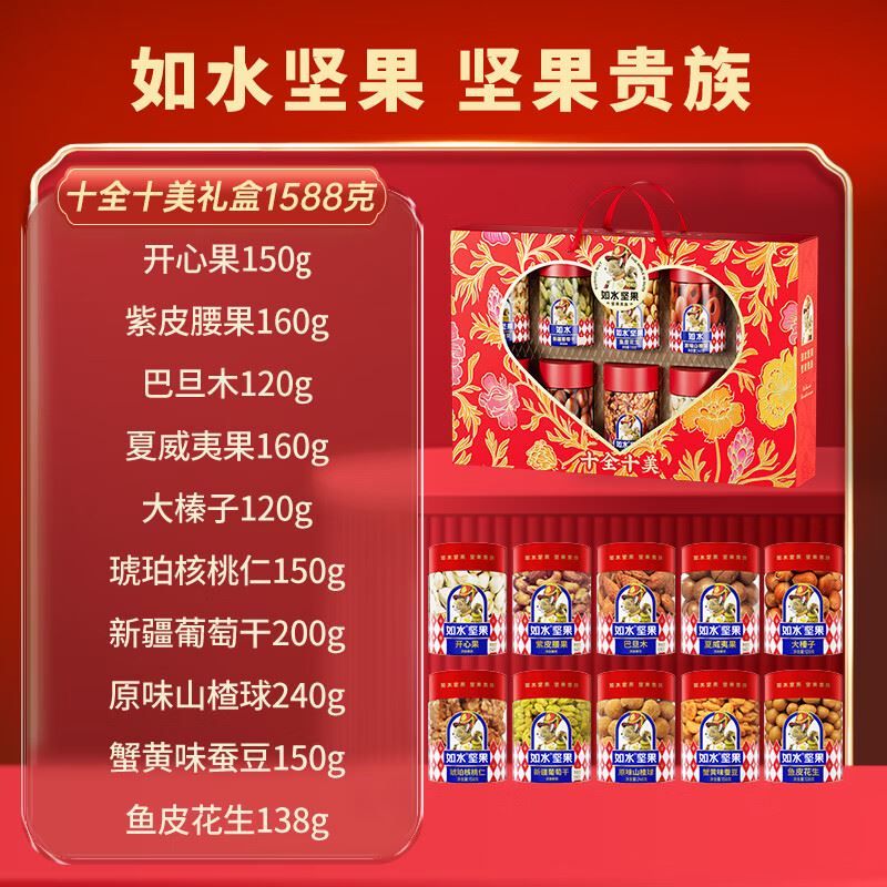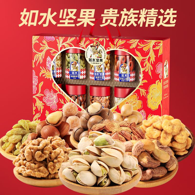 如水开心果150g 如水紫皮腰果160g 如水巴旦木120g 如水夏威夷果160g 如水大榛子120g 如水琥珀核桃仁150g 如水鱼皮花生138g 如水蟹黄味蚕豆150g 如水新疆葡萄干200g 如水原味山楂球240g