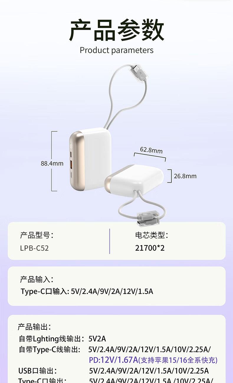 产品型号:LPB-C52 电池规格:锂离子电池3.7V10000毫安